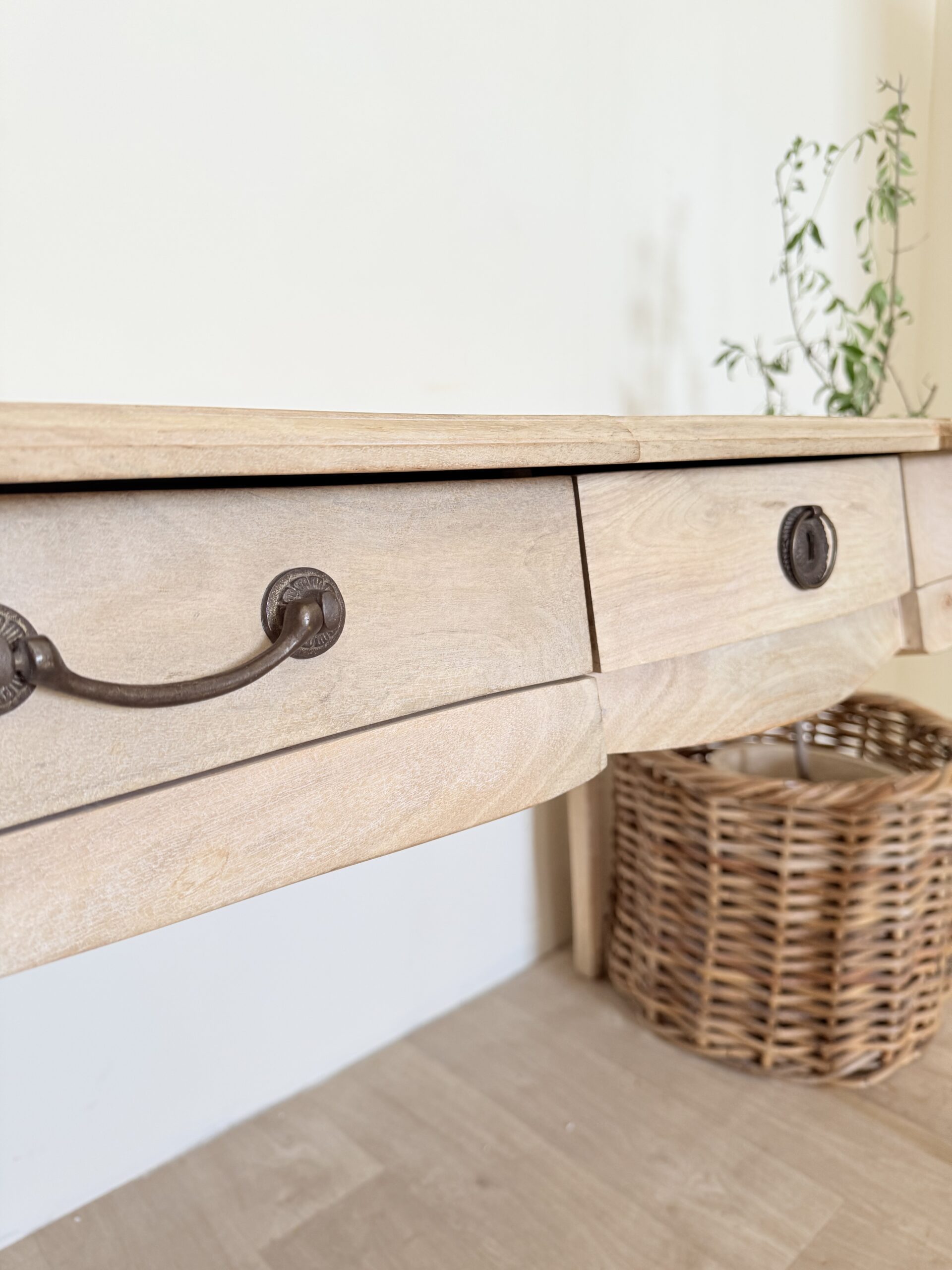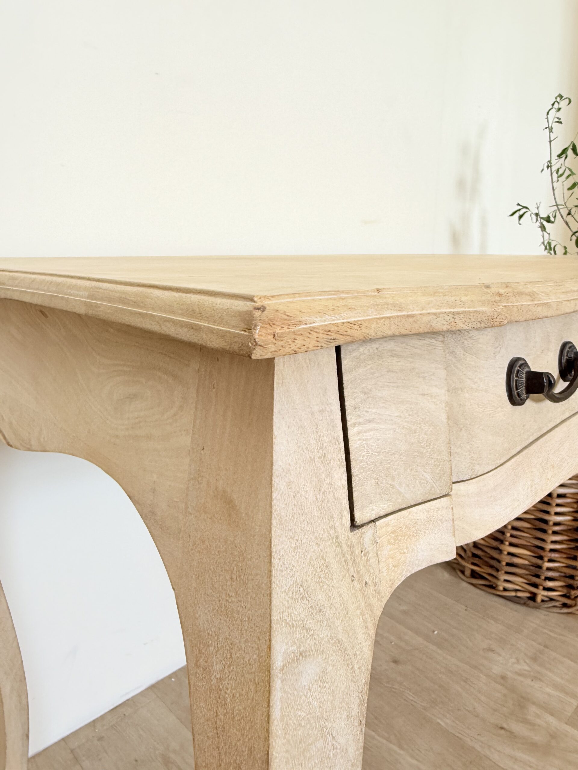 Na sprzedaż eleganckie biurko / konsolka wykonana z naturalnego drewna mango. Mebel wyróżnia się subtelną formą, lekką konstrukcją i piękną strukturą naturalnego drewna, dzięki czemu wprowadza do wnętrza ciepły i stylowy klimat.
