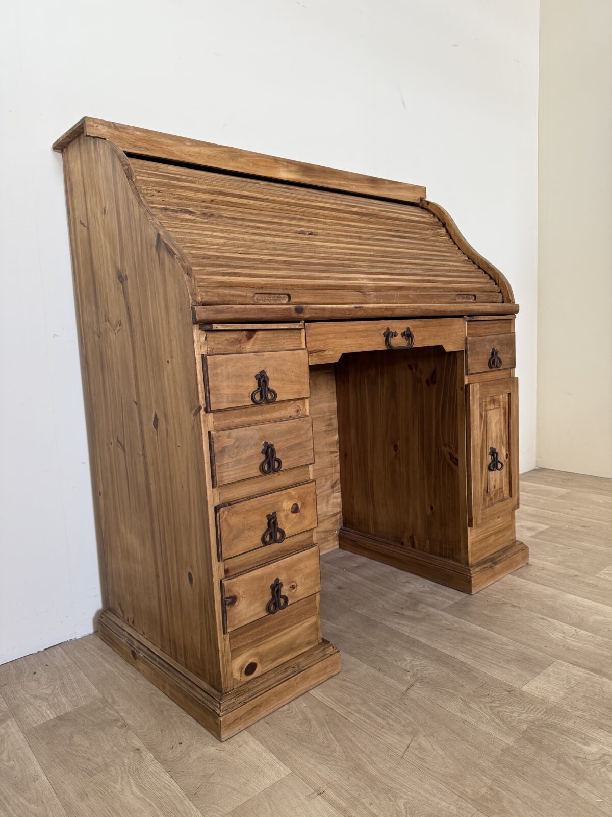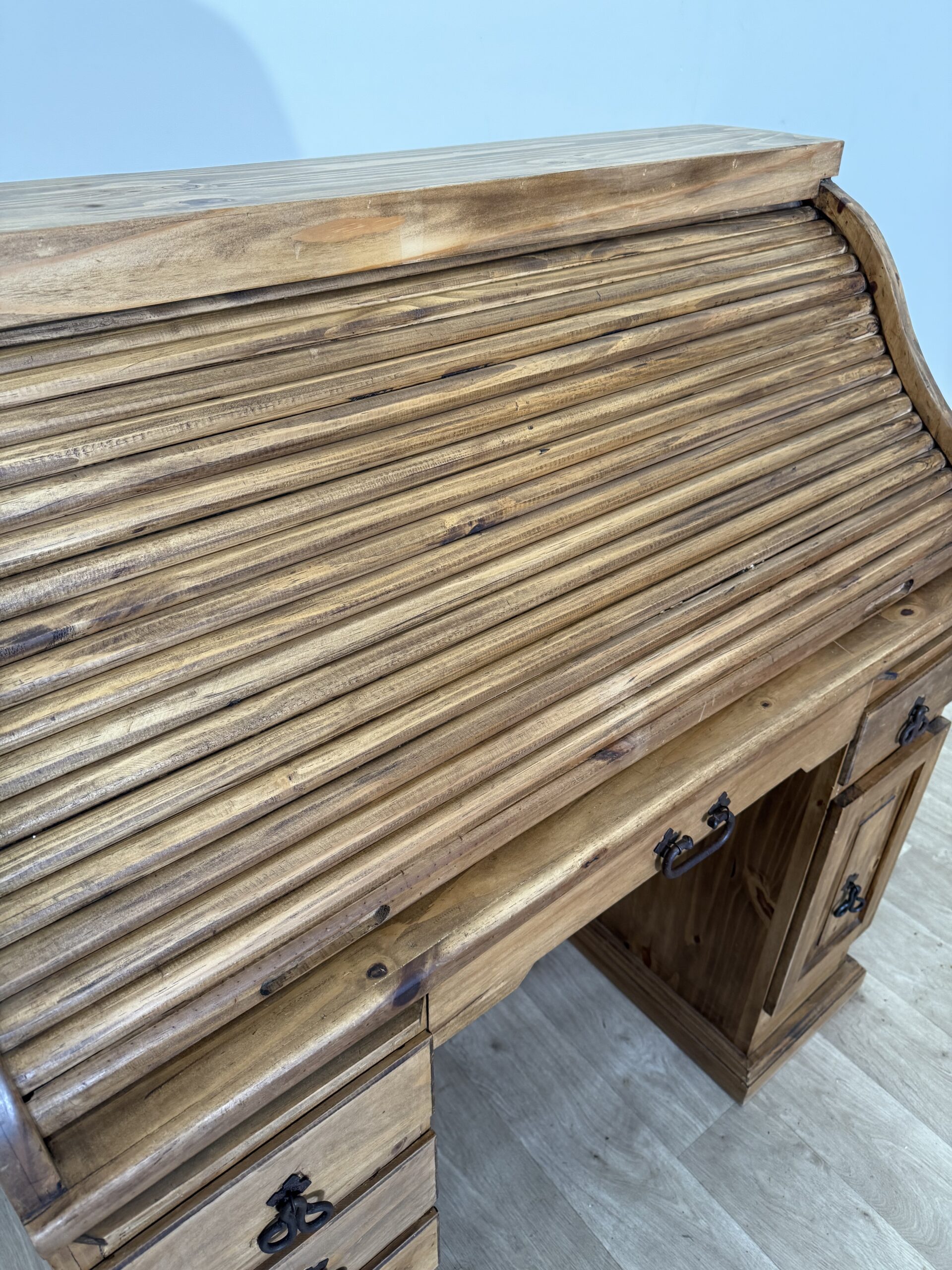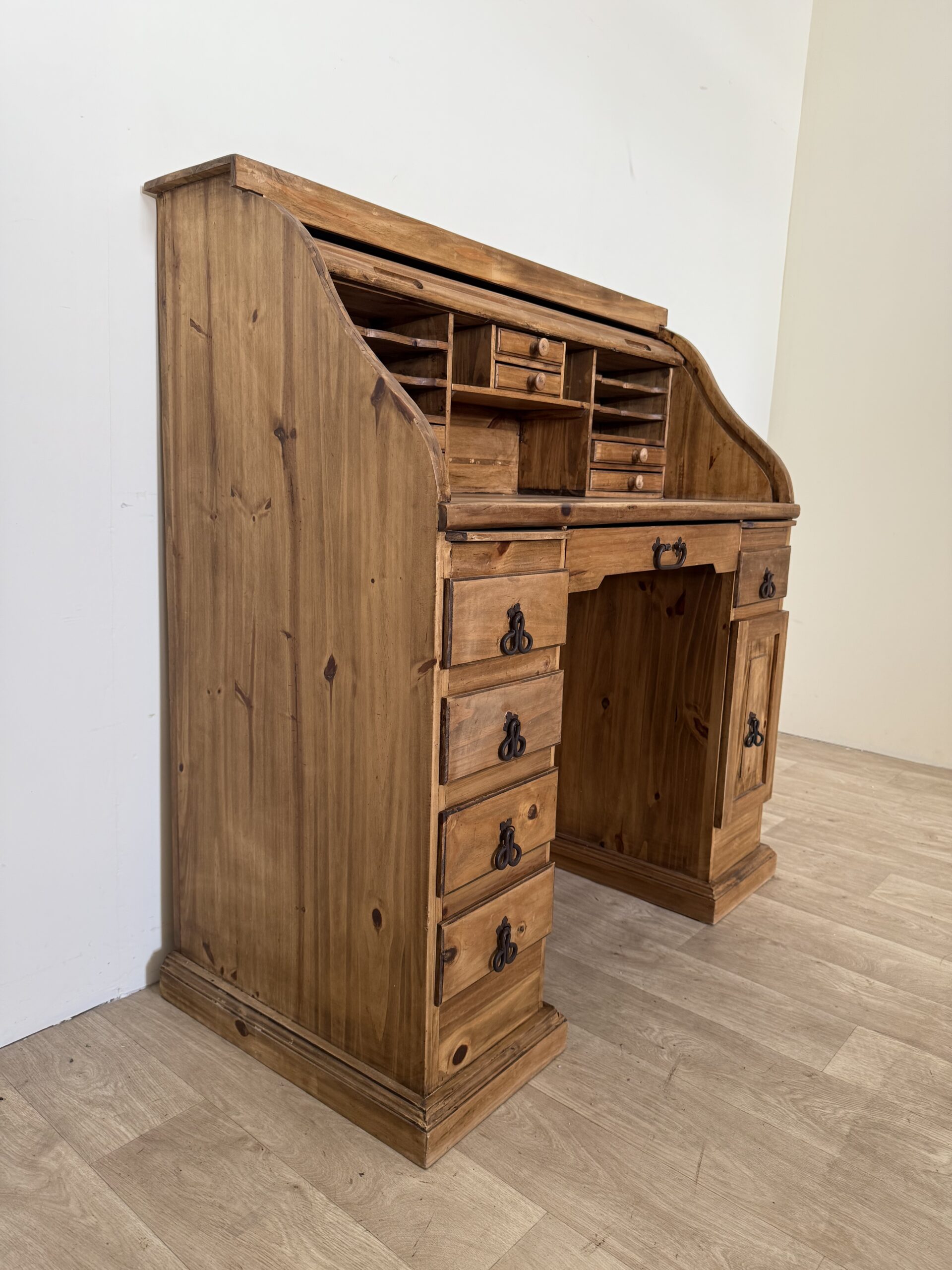Jednym z najbardziej charakterystycznych elementów biurka jest praktyczna roleta, która pozwala w szybki sposób ukryć przestrzeń roboczą, wprowadzając jednocześnie nutę dawnych czasów, kiedy takie rozwiązania były symbolem funkcjonalności i porządku. Liczne szufladki oferują ogrom miejsca do przechowywania – od dokumentów, przez przybory biurowe, aż po drobne przedmioty codziennego użytku.