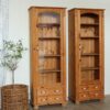 Fronty witrynek zdobią eleganckie przeszklenia, które pięknie eksponują zawartość – porcelanę, szkło, książki czy pamiątki rodzinne. W dolnej części znajdują się praktyczne szuflady z białymi, porcelanowymi uchwytami, które dodają meblom lekkości i subtelnego uroku. Każdy detal, od wyprofilowanego wieńca po toczone nóżki, został starannie dopracowany, co nadaje witrynkom niepowtarzalny charakter i wyjątkowy styl.