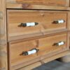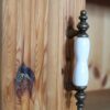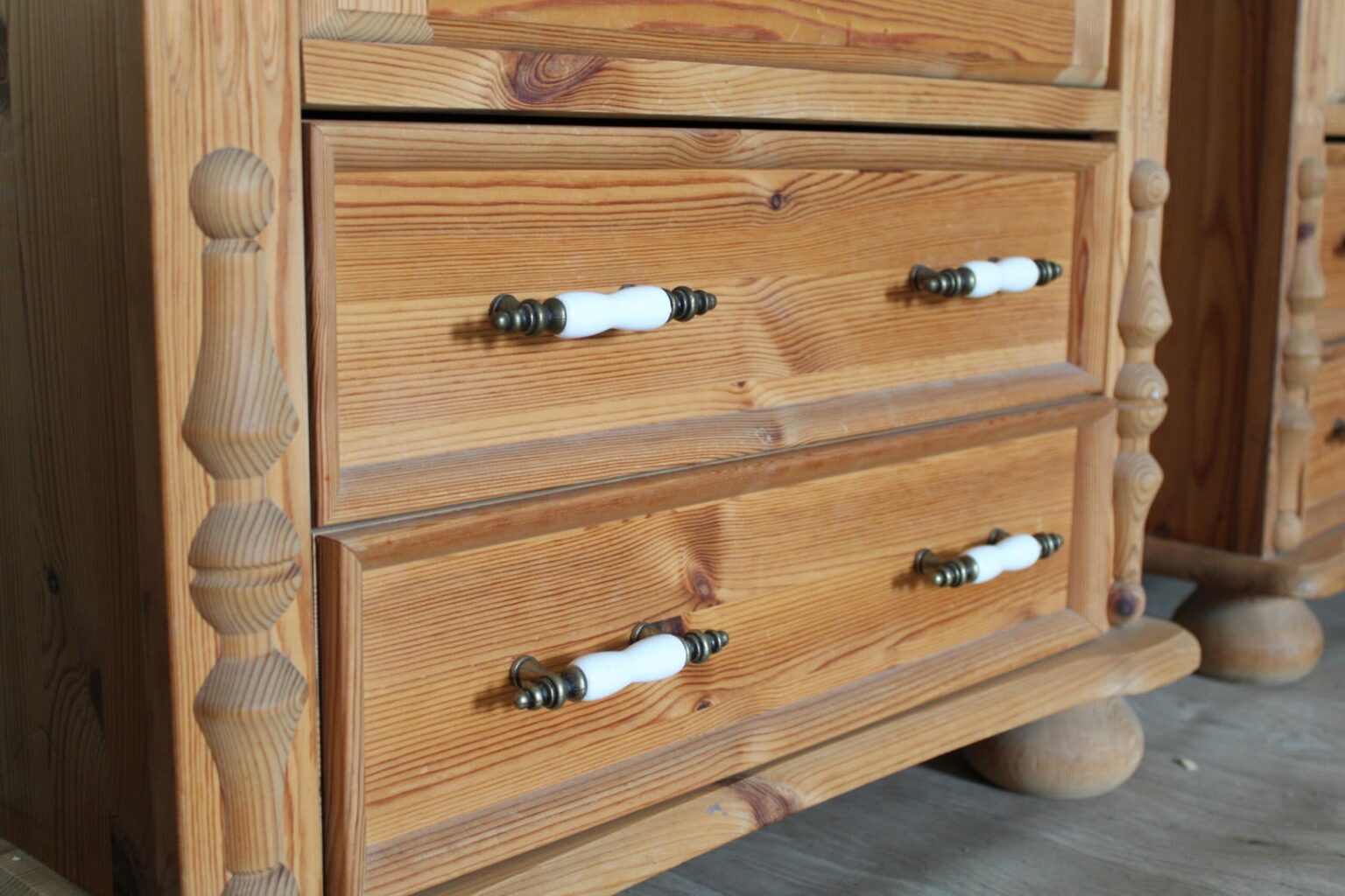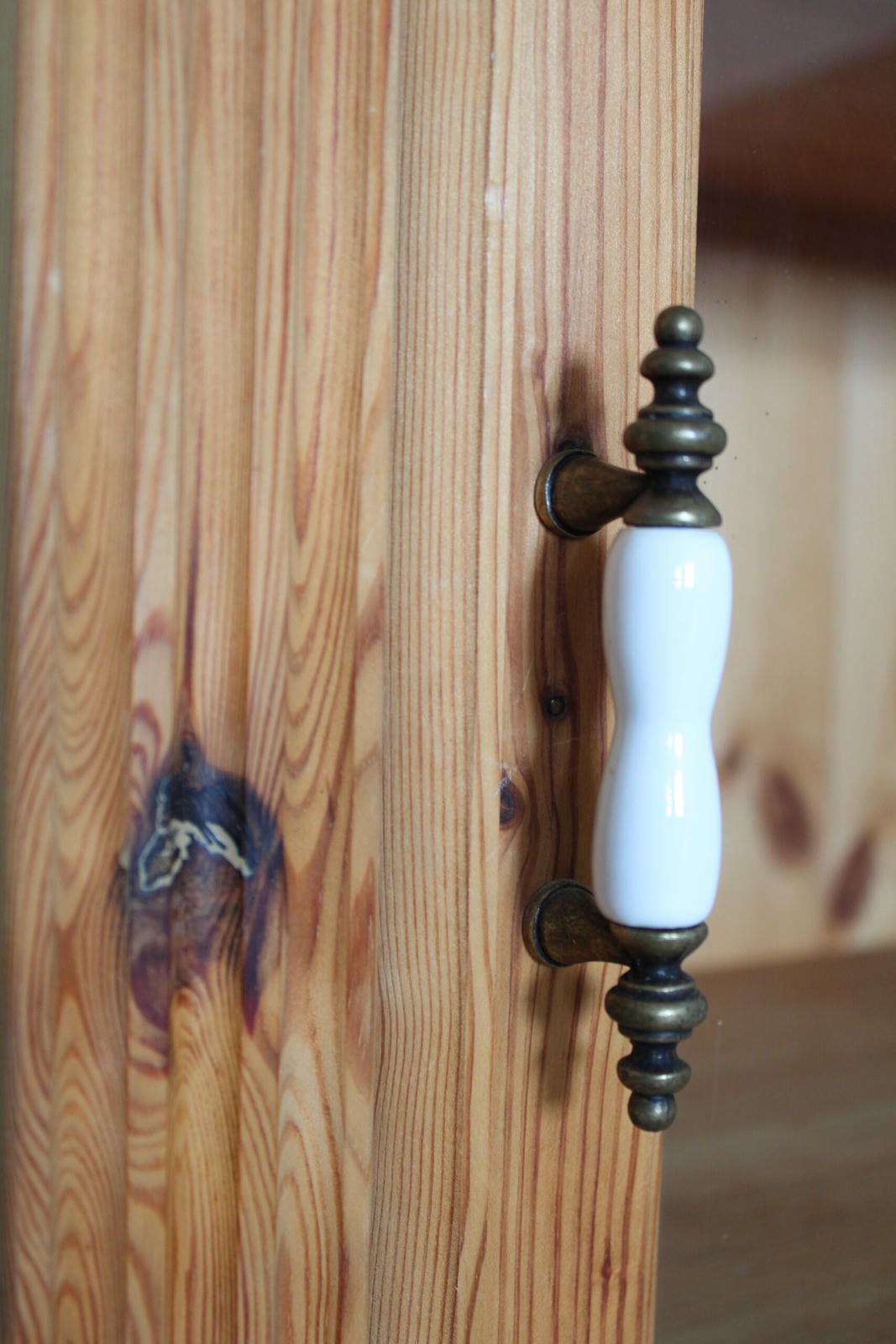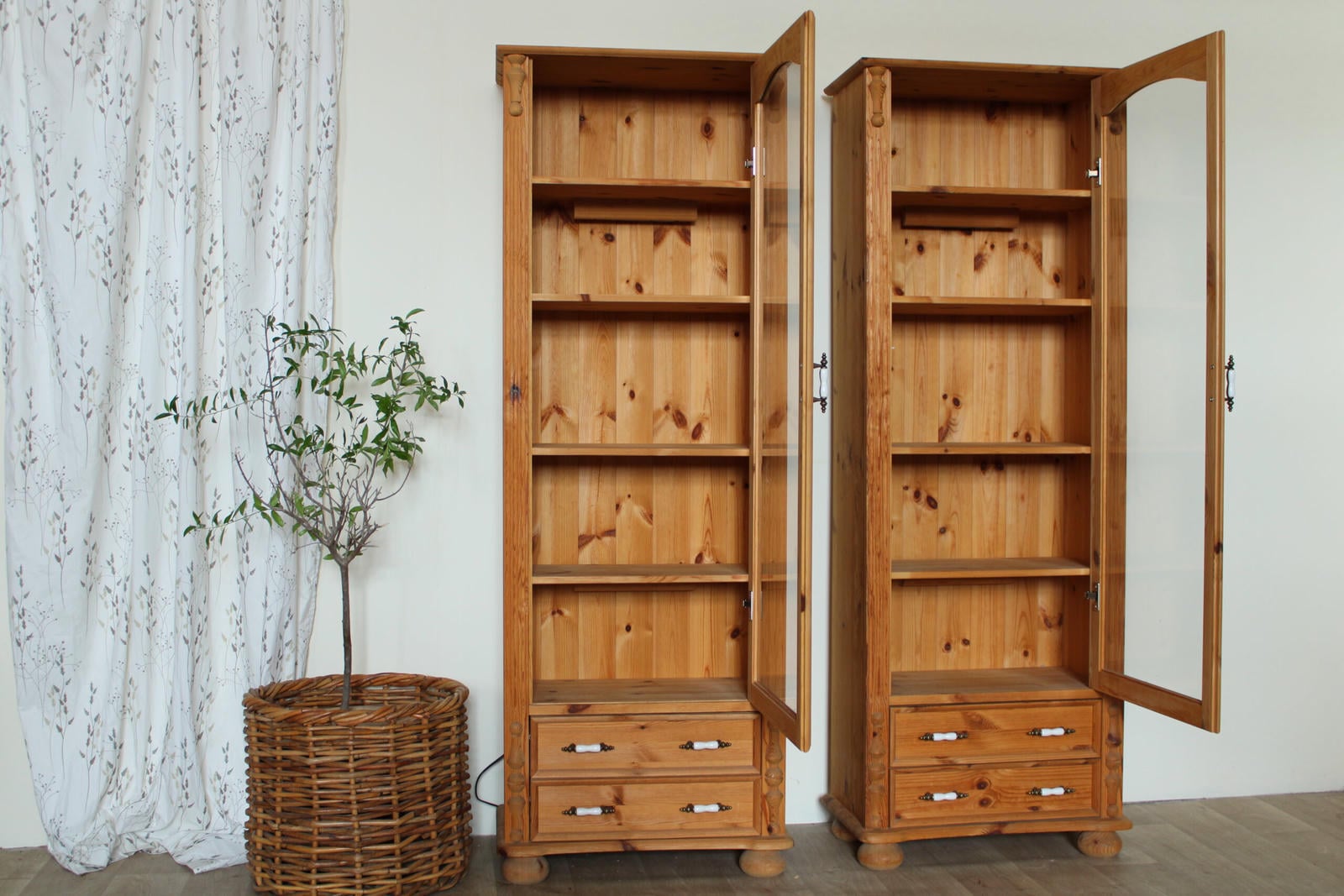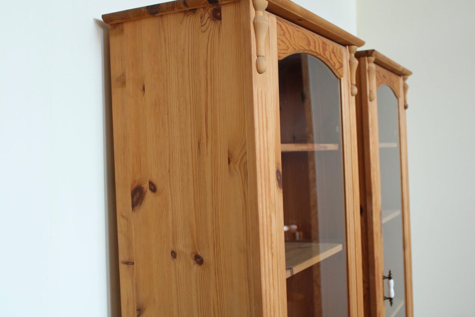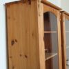Dwie stylowe witrynki sosnowe w stylu vintage. Solidne, rustykalne meble wykonane z litego drewna sosnowego. Białe uchwyty dodają lekkości, a naturalny odcień drewna ociepla każde wnętrze.