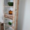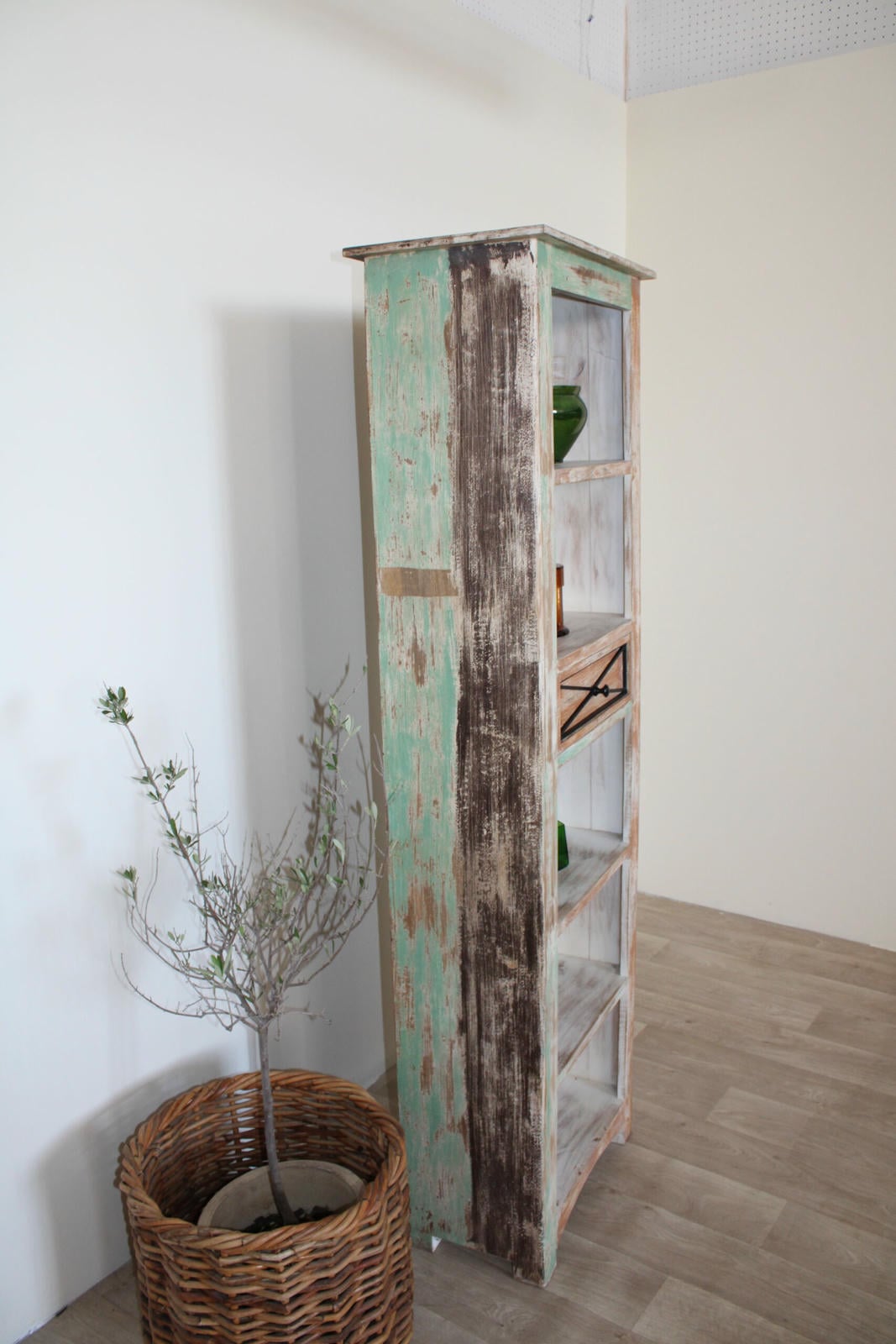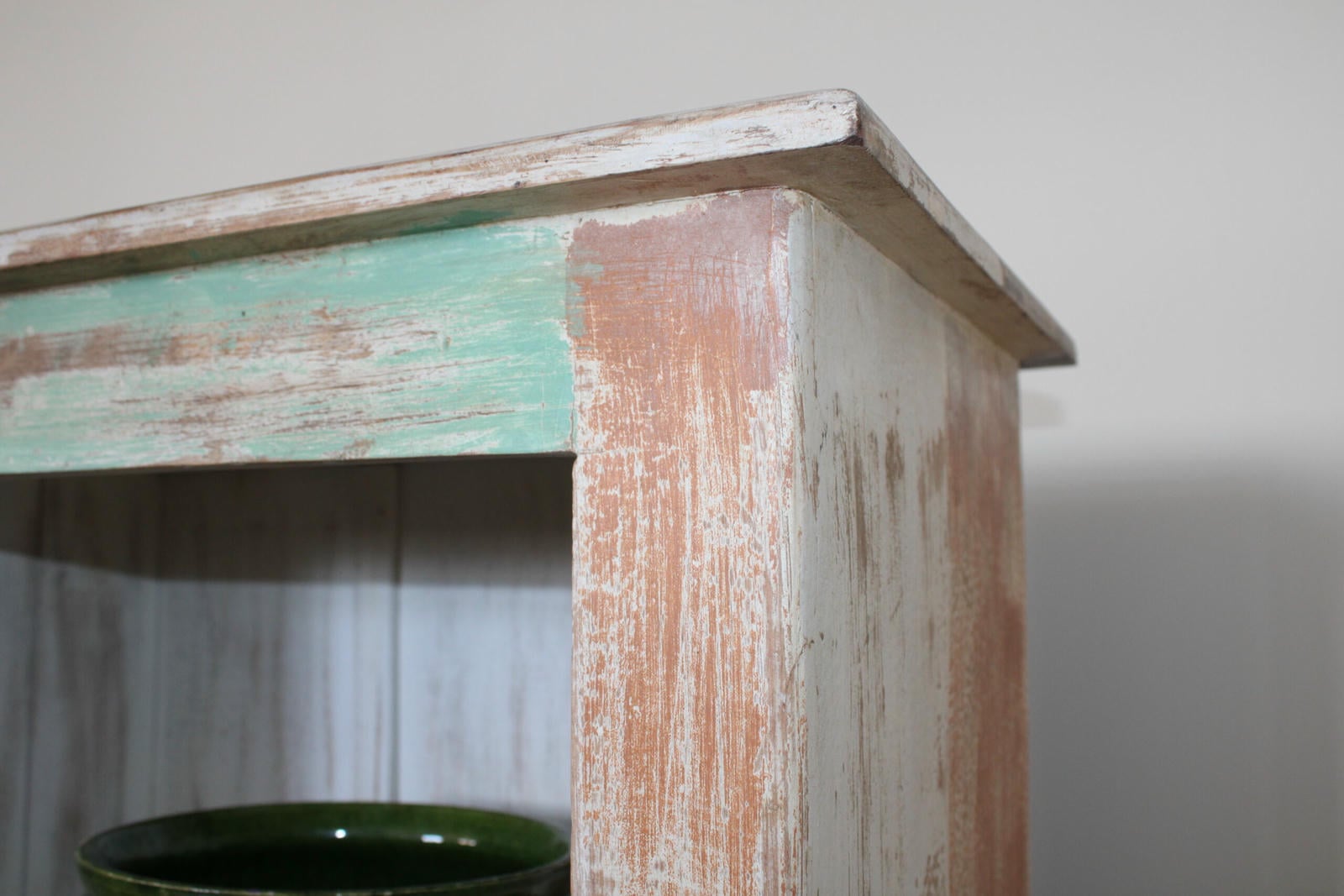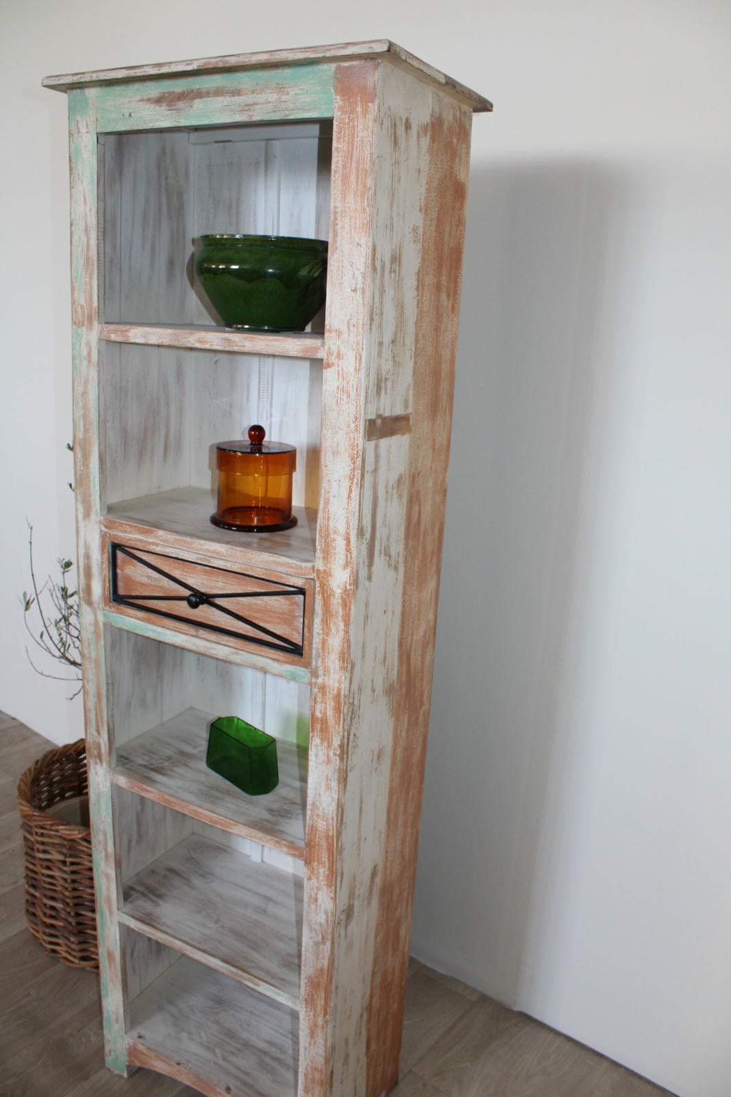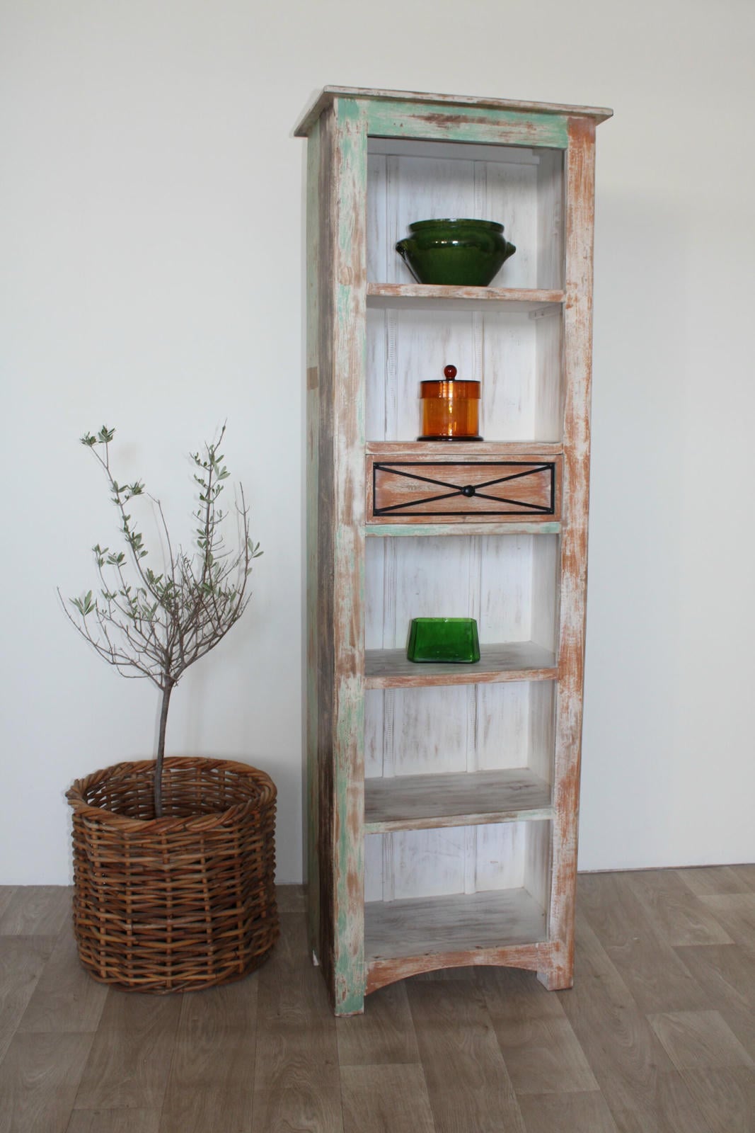 Ten drewniany regał w stylu shabby chic to mebel, który opowiada własną historię. Ręcznie wykończony, z pięknie przetartą powierzchnią w kolorach mięty, bieli i naturalnego drewna, emanuje ciepłem i autentycznością.