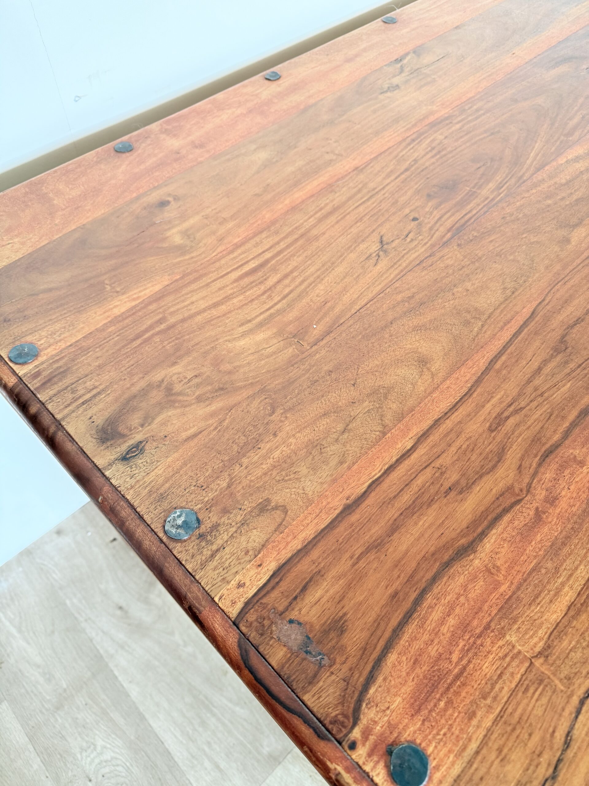 Blat stołu posiada delikatne rysy, które są widoczne głównie pod światło. Nie wpływają one na funkcjonalność mebla, a wręcz podkreślają jego autentyczność i historię użytkowania. To subtelny detal, który nadaje stołowi unikalnego charakteru i wyróżnia go spośród nowych, idealnie gładkich mebli.