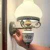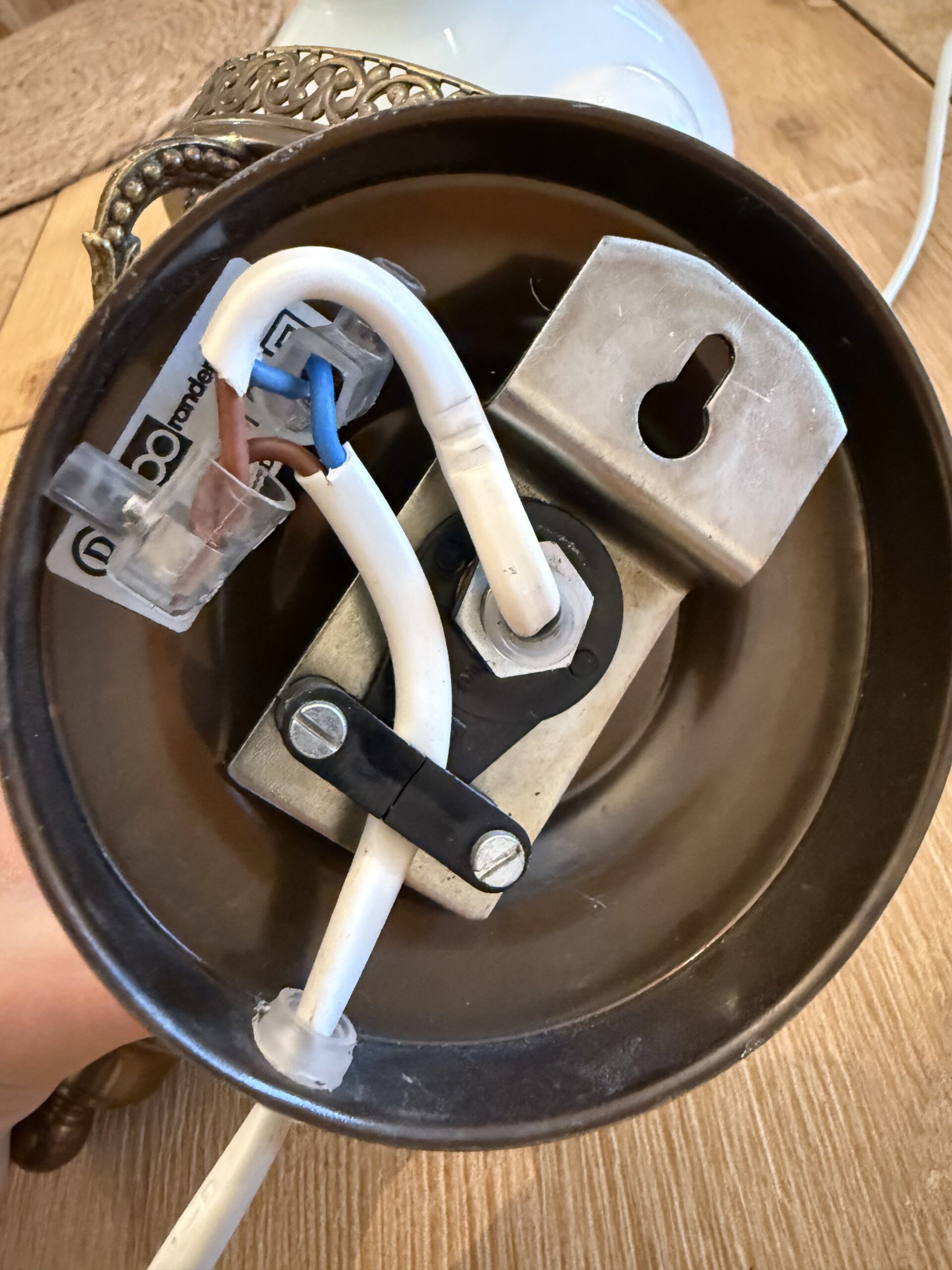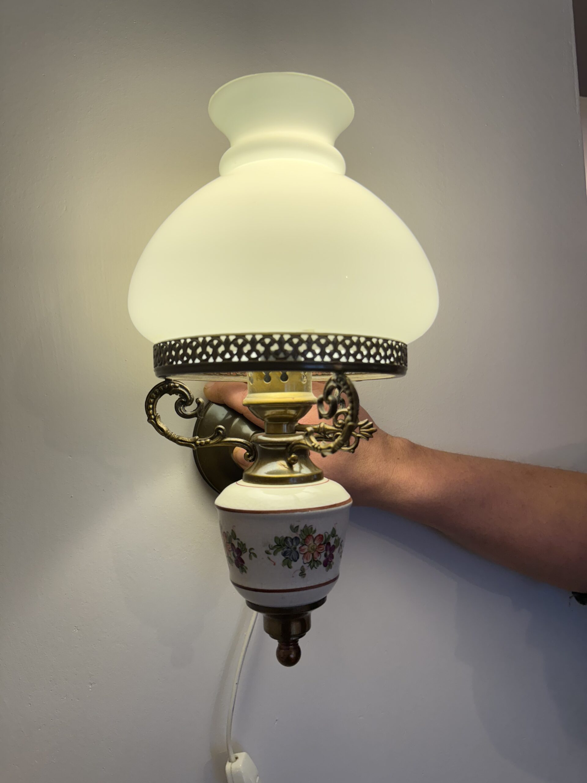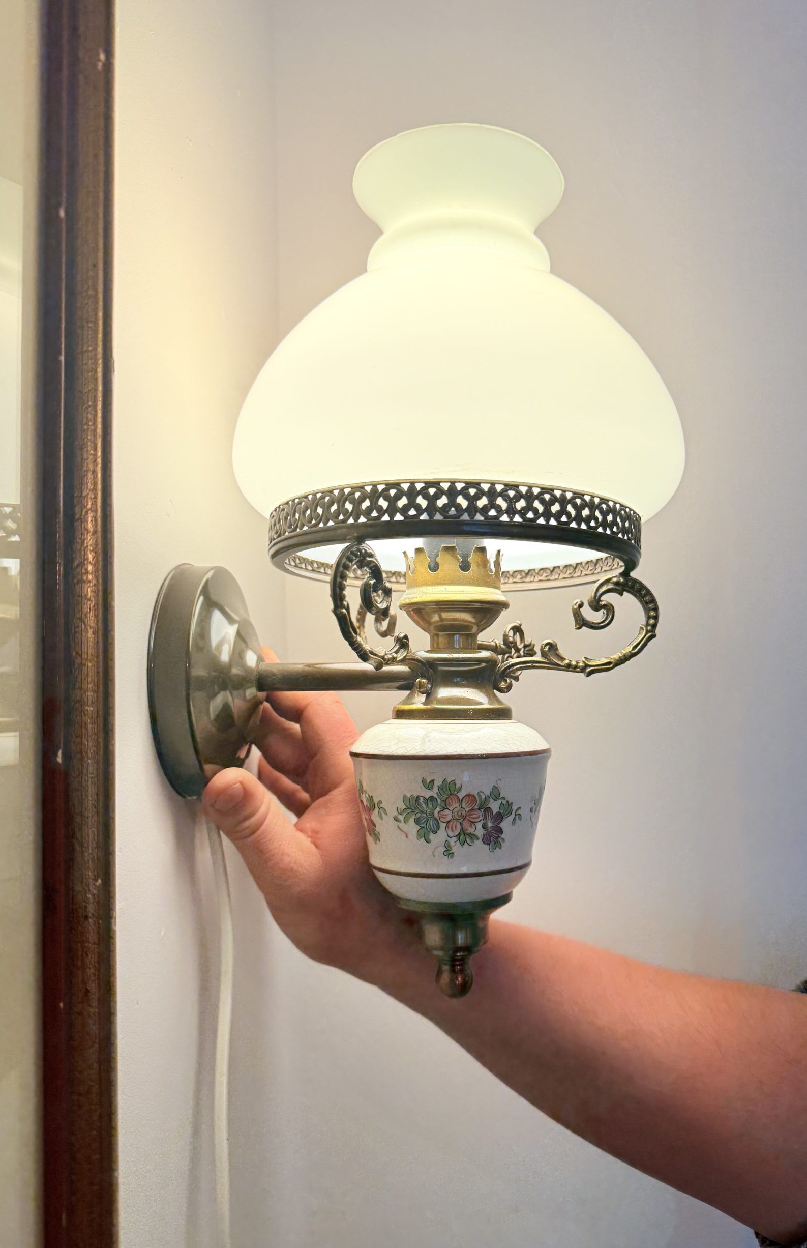 Kinkiet jest przystosowany do włączania bezpośrednio do gniazdka, co czyni go praktycznym i łatwym w montażu rozwiązaniem. Nie posiada uziemienia, co jest charakterystyczne dla lamp z minionych dekad i podkreśla jej autentyczny, vintage’owy charakter. Emitując ciepłe, nastrojowe światło, lampa tworzy przytulną atmosferę i stanowi idealne uzupełnienie naturalnych, spokojnych aranżacji wnętrz.