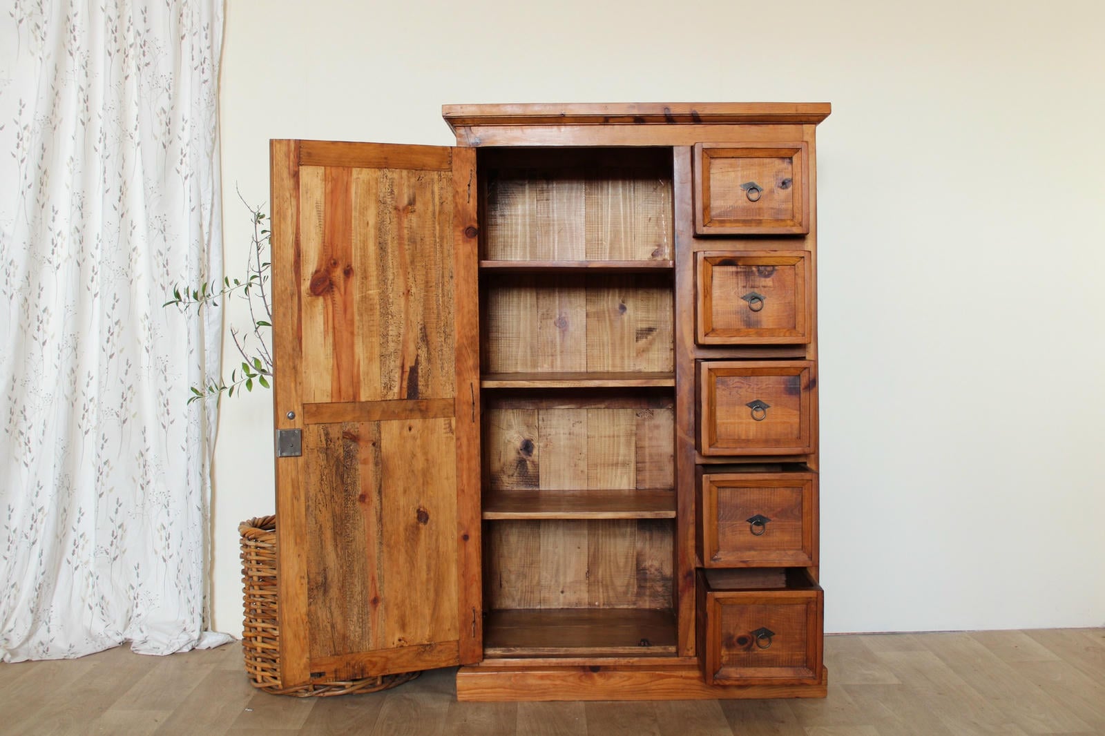 Ta wyjątkowa komoda z litego drewna pini to mebel z duszą, który wnosi do wnętrza ciepło, spokój i naturalny wdzięk. Wykonana z solidnego, naturalnego drewna, zachwyca swoją strukturą, subtelnymi przetarciami i śladami historii, które nadają jej autentyczności. Jej klasyczna forma oraz rustykalny charakter sprawiają, że doskonale odnajdzie się w przestrzeniach w stylu vintage, boho, klasycznym lub wiejskim.