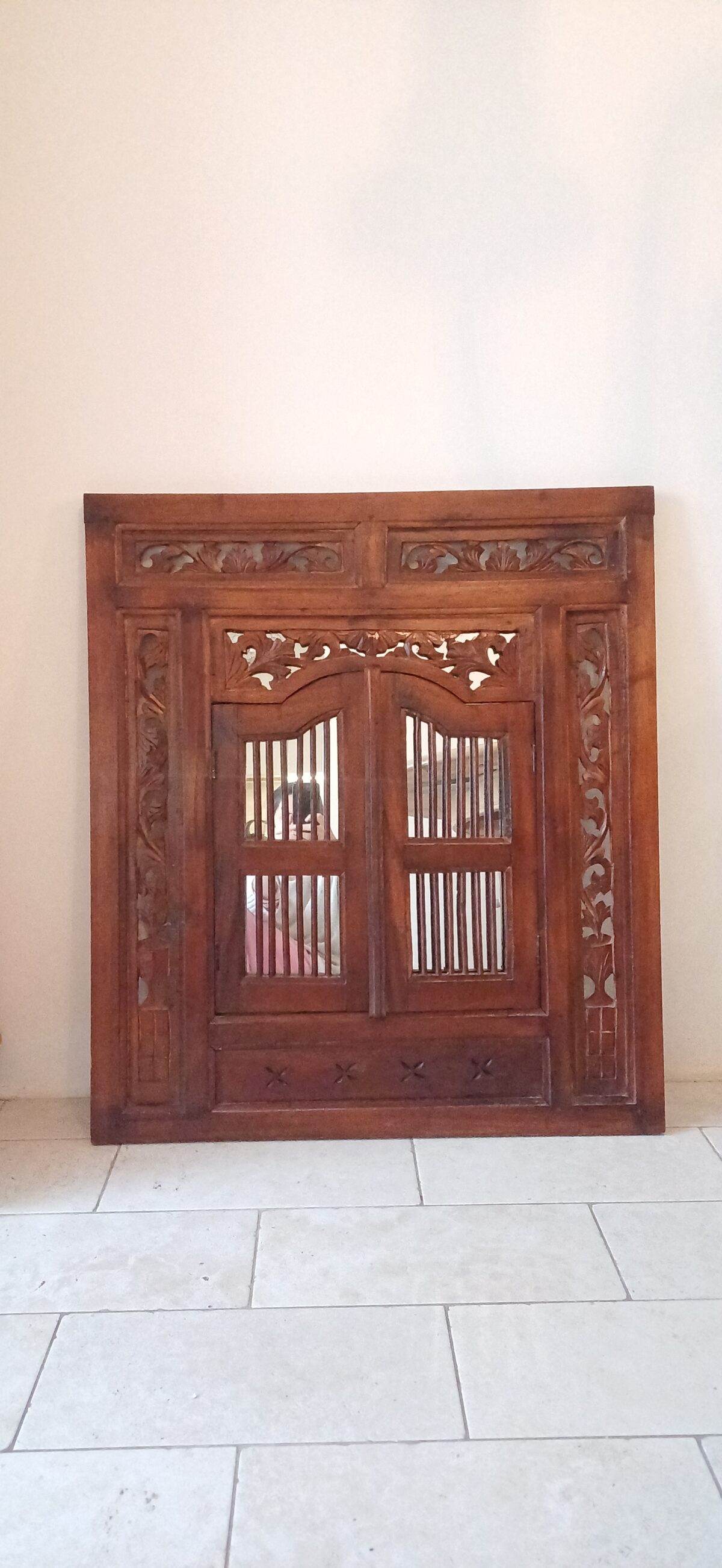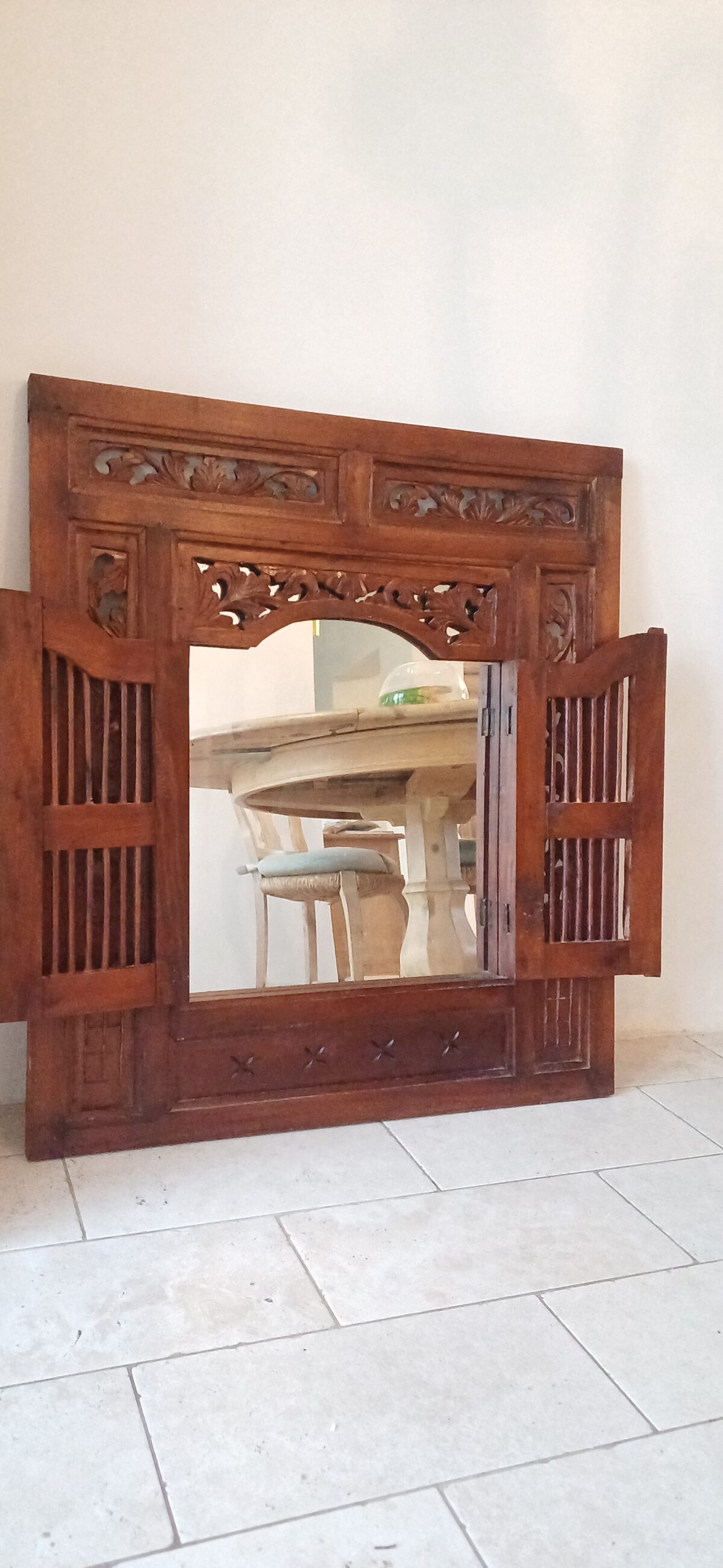 Otwierana forma, inspirowana tradycyjną okiennicą, nadaje meblowi unikatowy charakter i sprawia, że lustro staje się nie tylko praktycznym elementem wyposażenia, ale również dekoracją ściany. Skrzydła można rozłożyć, aby optycznie powiększyć przestrzeń i wzmocnić efekt światła, lub zamknąć – uzyskując bardziej kameralny, dekoracyjny akcent.