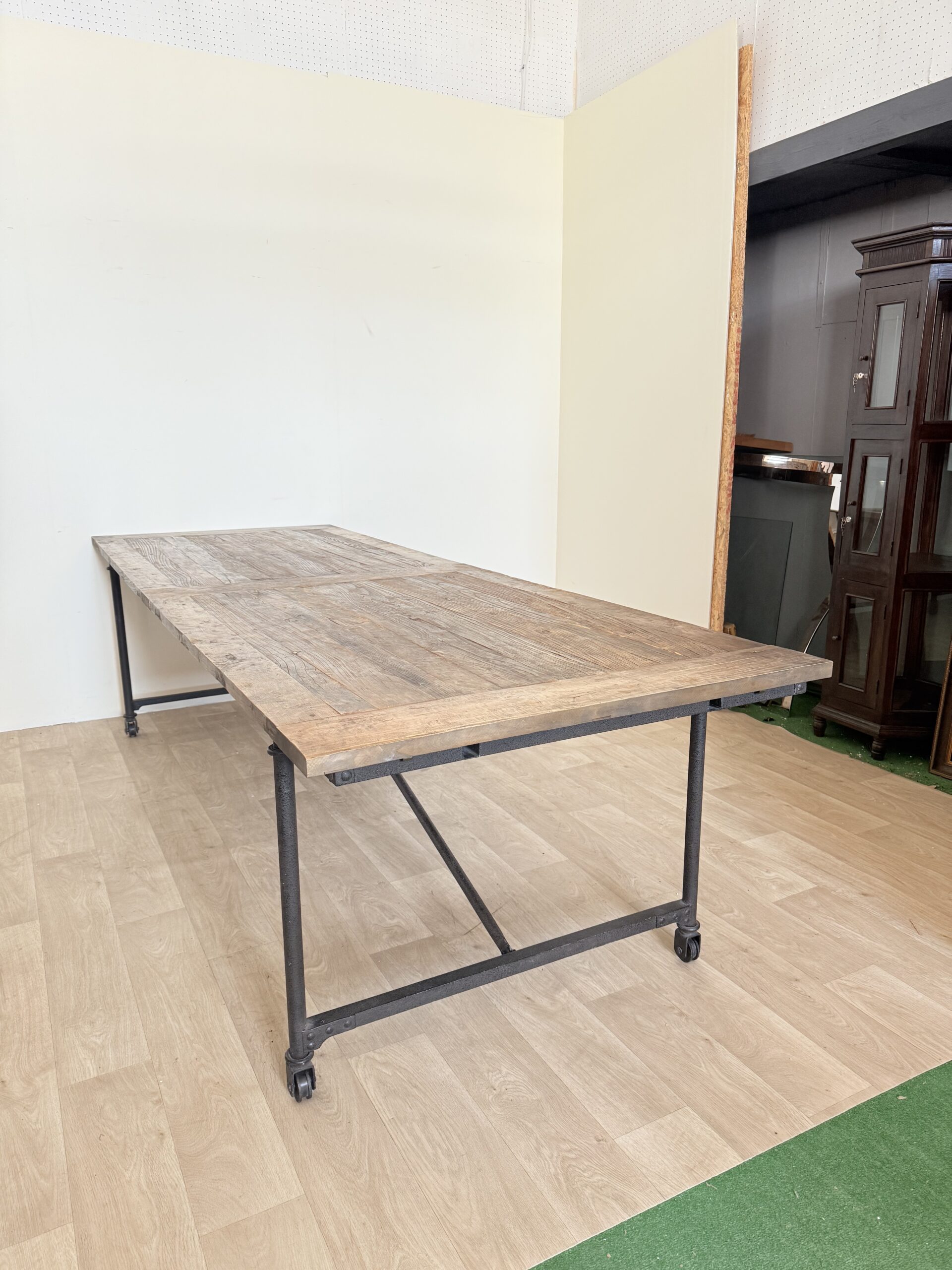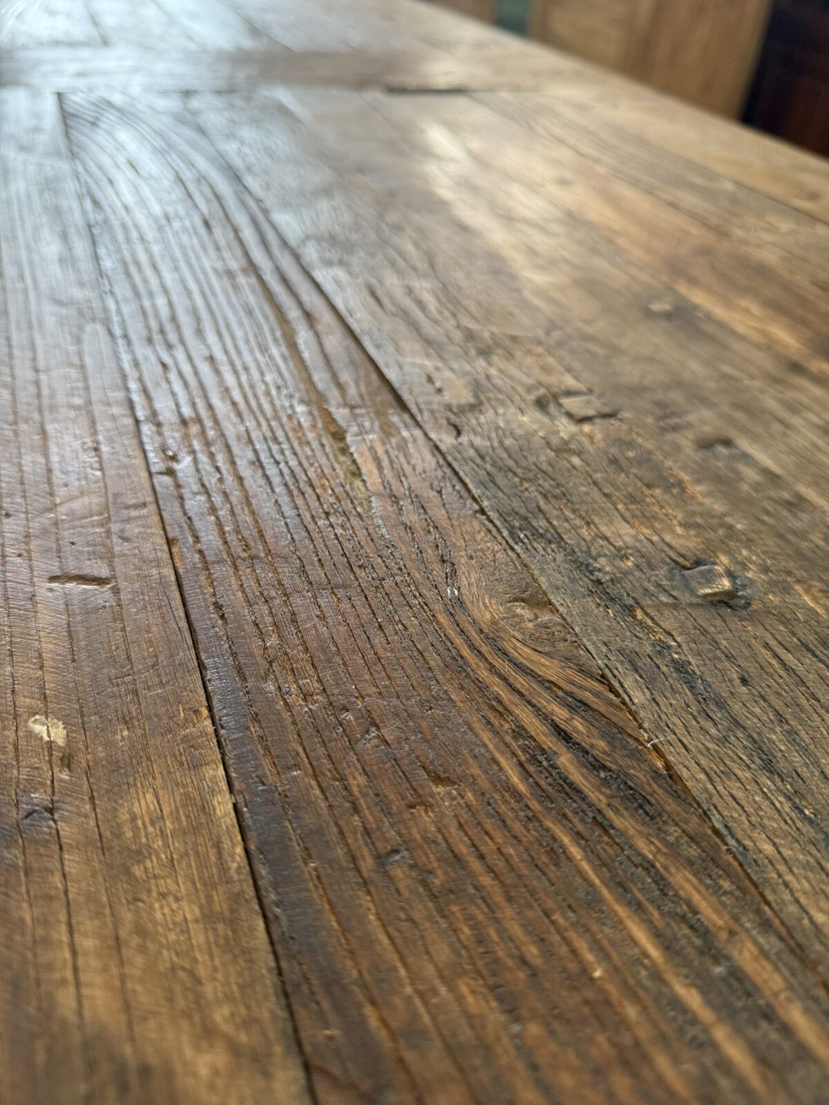 Ten stół industrialny to kwintesencja autentyczności i świadomego designu. Wykonany z drewna z odzysku, zachowuje w sobie ślady przeszłości – naturalne spękania, przetarcia, różnice w strukturze i kolorze, które tworzą unikalną, nierówną powierzchnię. Każdy fragment blatu ma swoją historię, a razem tworzą one spójną opowieść o czasie, który nadał temu meblowi wyjątkowy charakter.