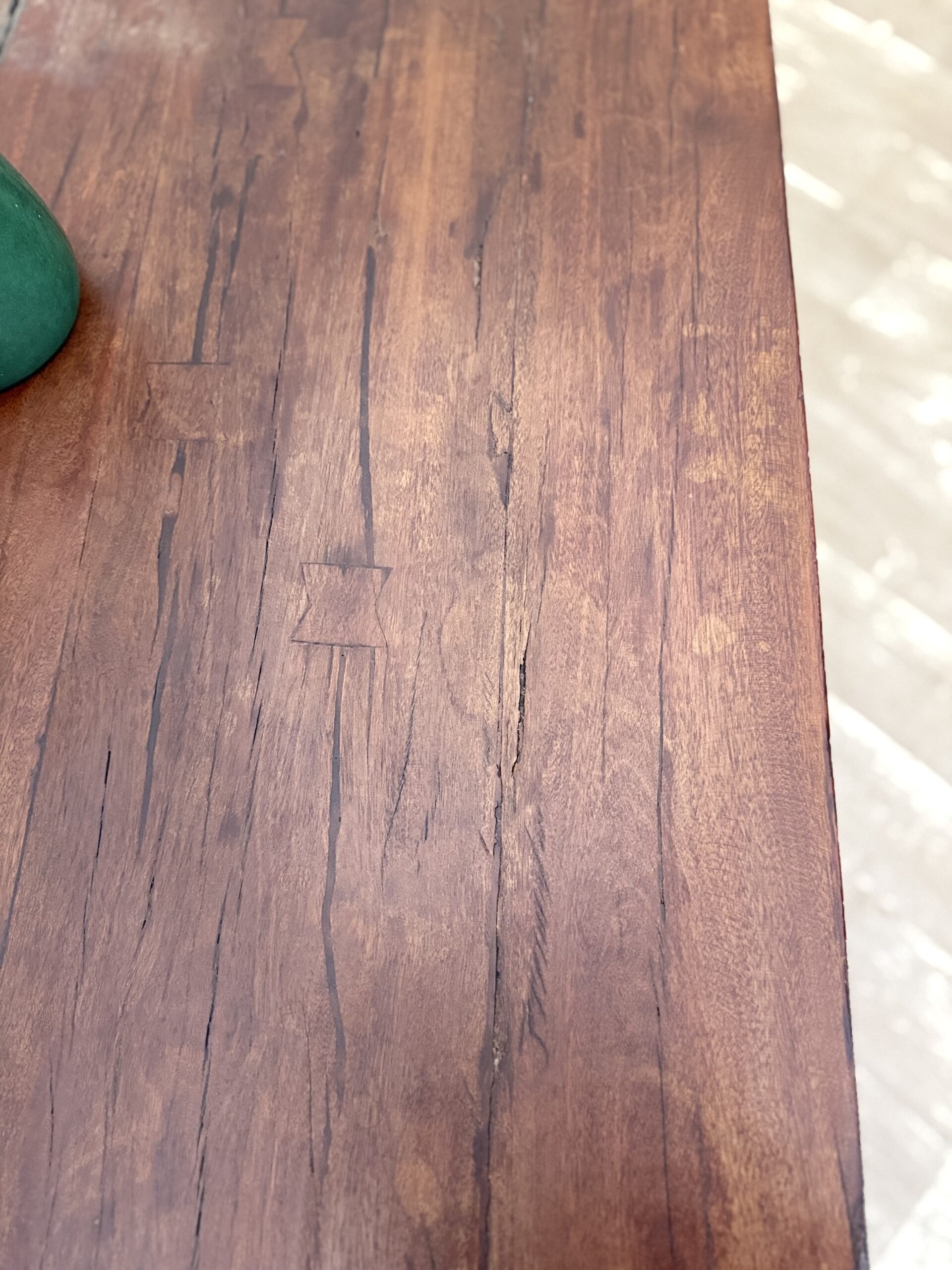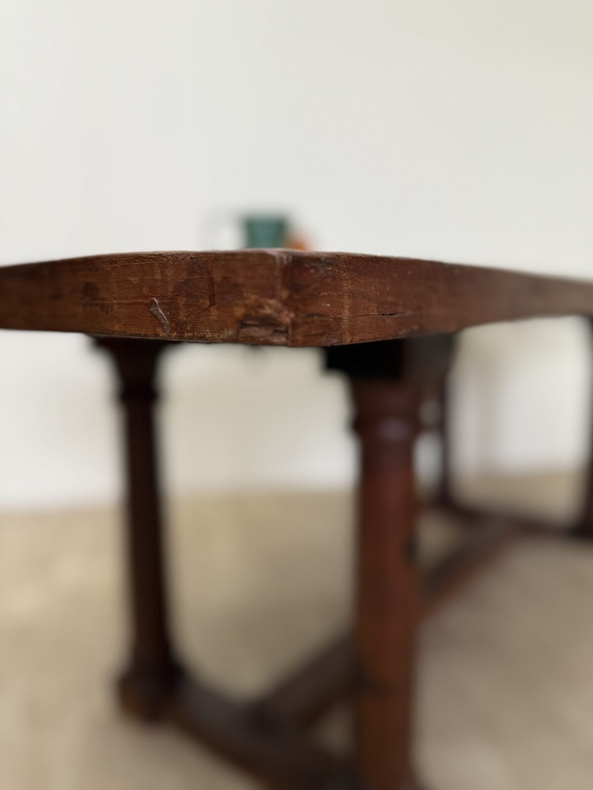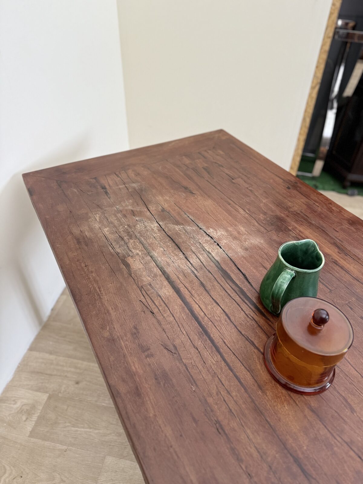 To nie jest współczesna stylizacja – to oryginalny mebel z naturalnymi oznakami upływu czasu. Szlachetna patyna, subtelne przetarcia i niuanse powierzchni tworzą efekt, którego nie da się podrobić. Każdy ślad jest częścią historii tego stołu i potwierdzeniem jego autentyczności.