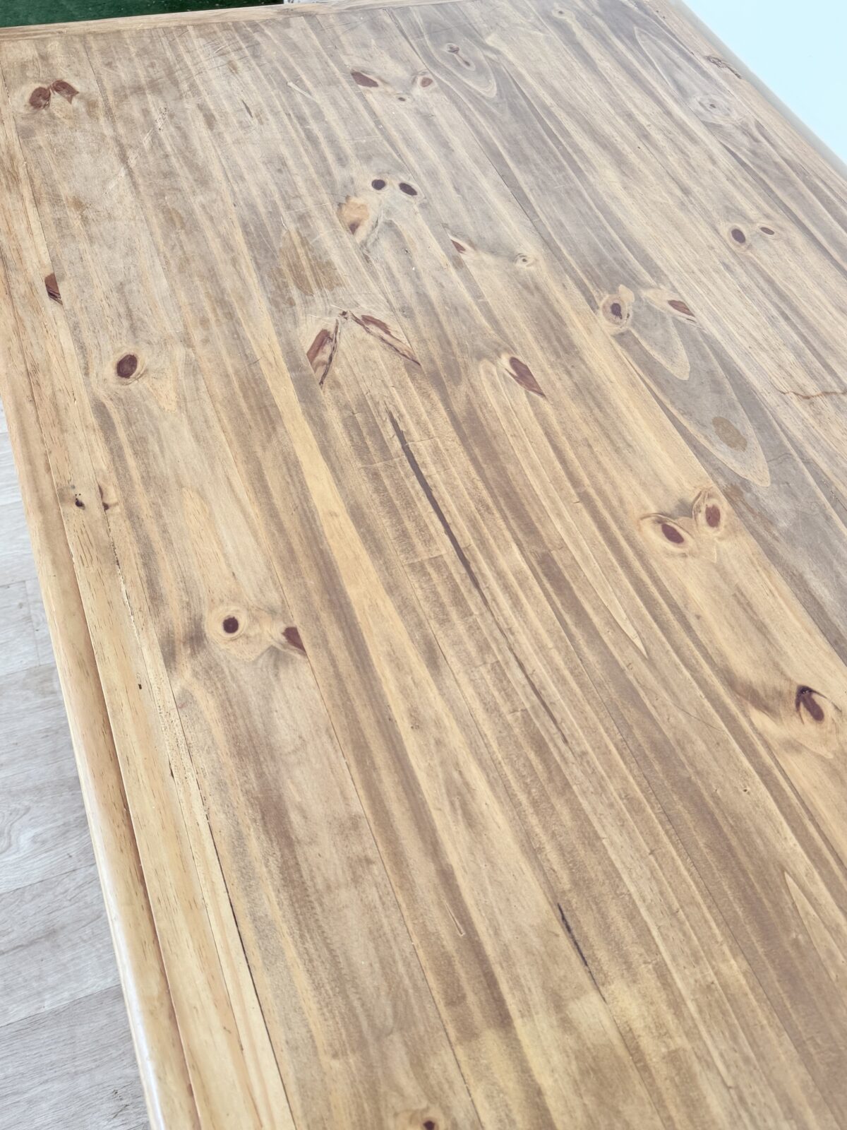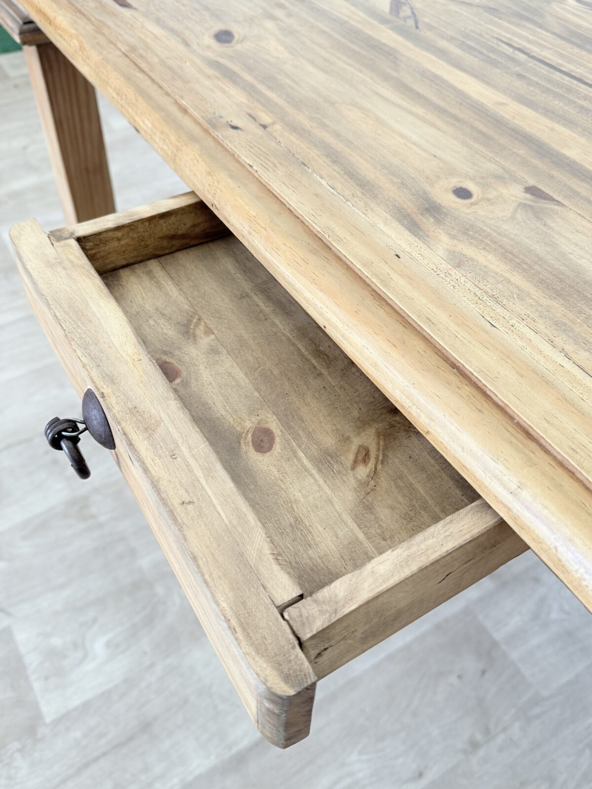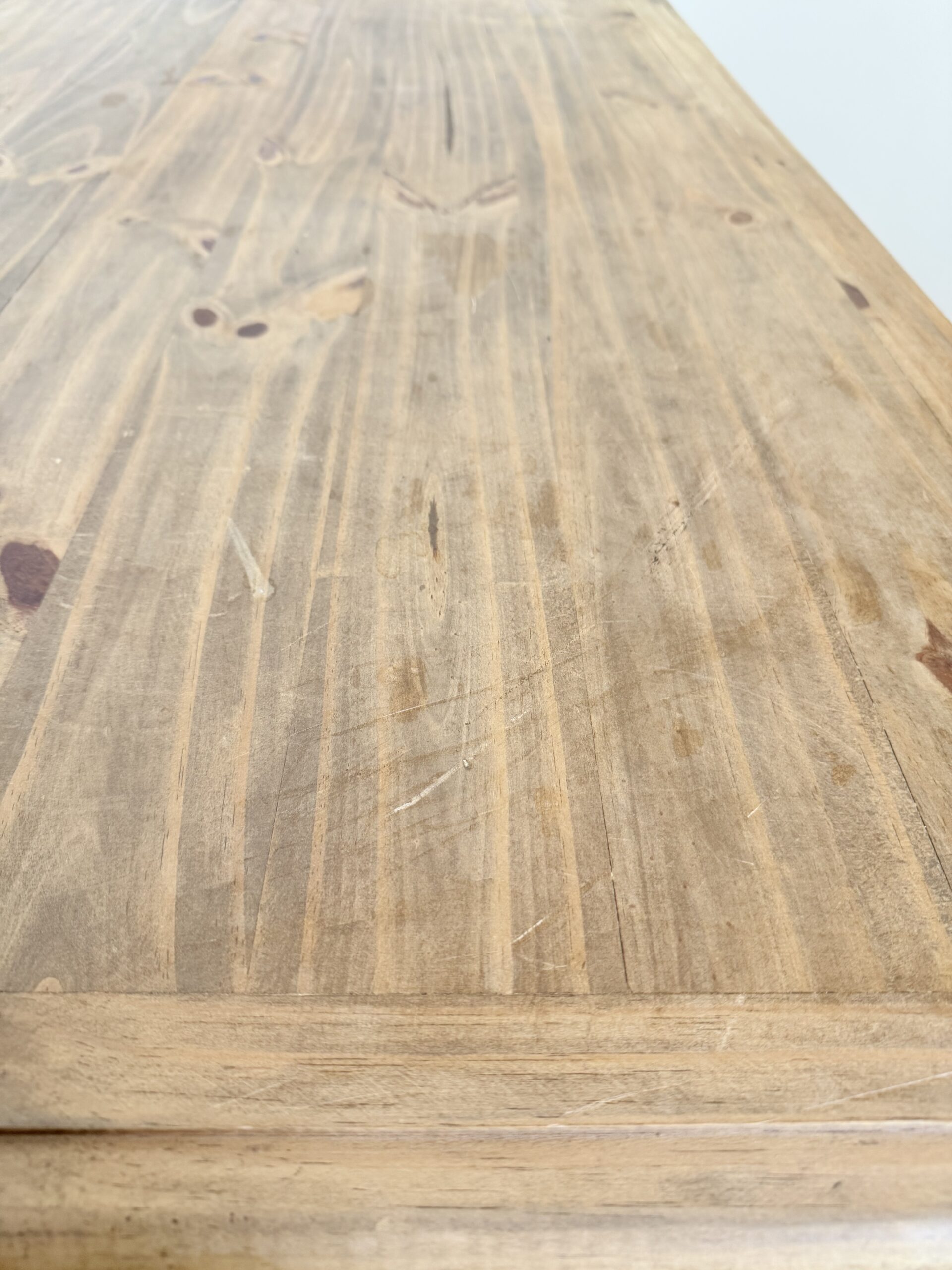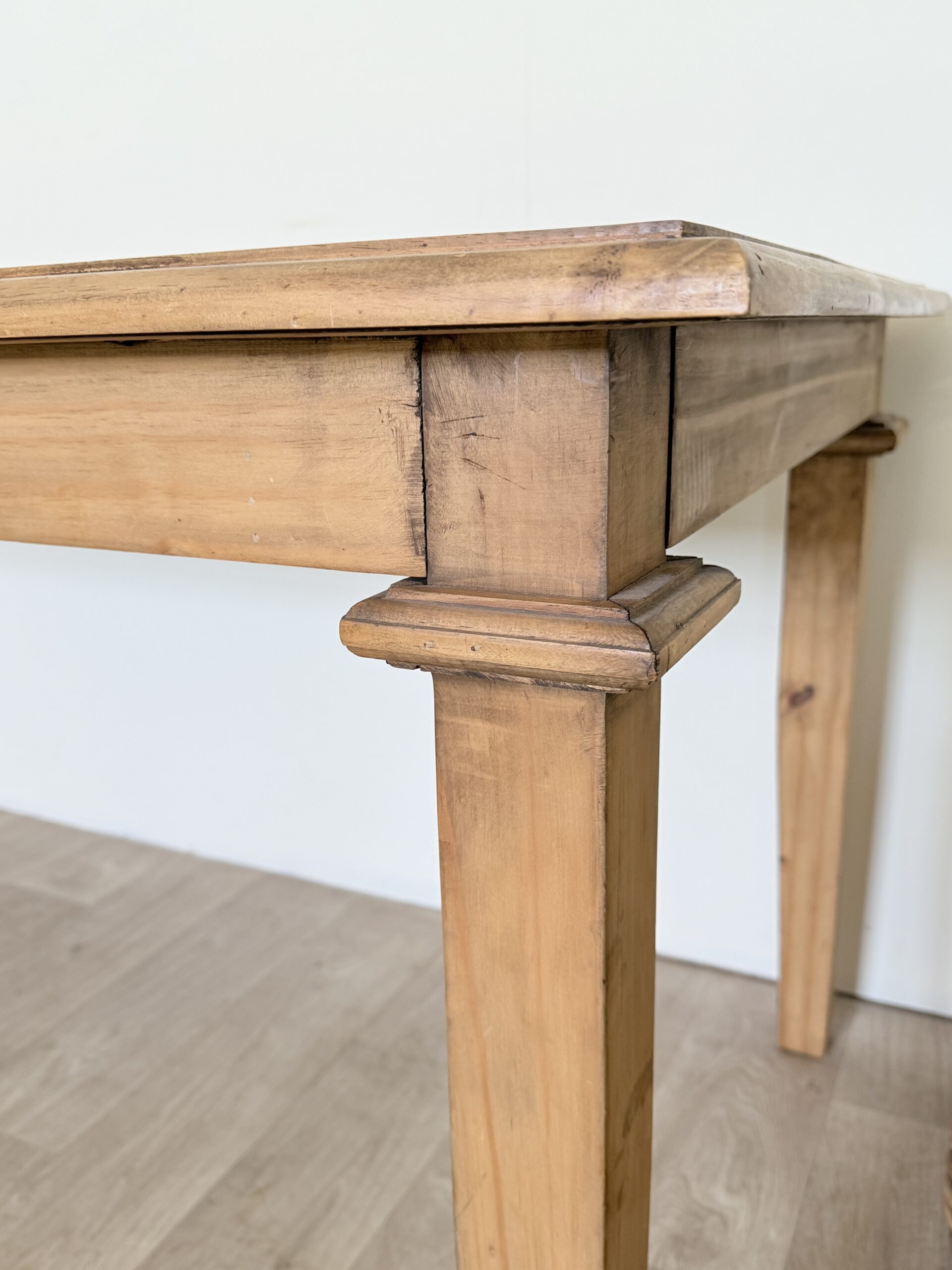 Drewniany stół wykonany z litej pini, w stylu rustykalnym farmhouse. Blat nosi naturalne oznaki upływu czasu, które podkreślają jego autentyczny charakter.