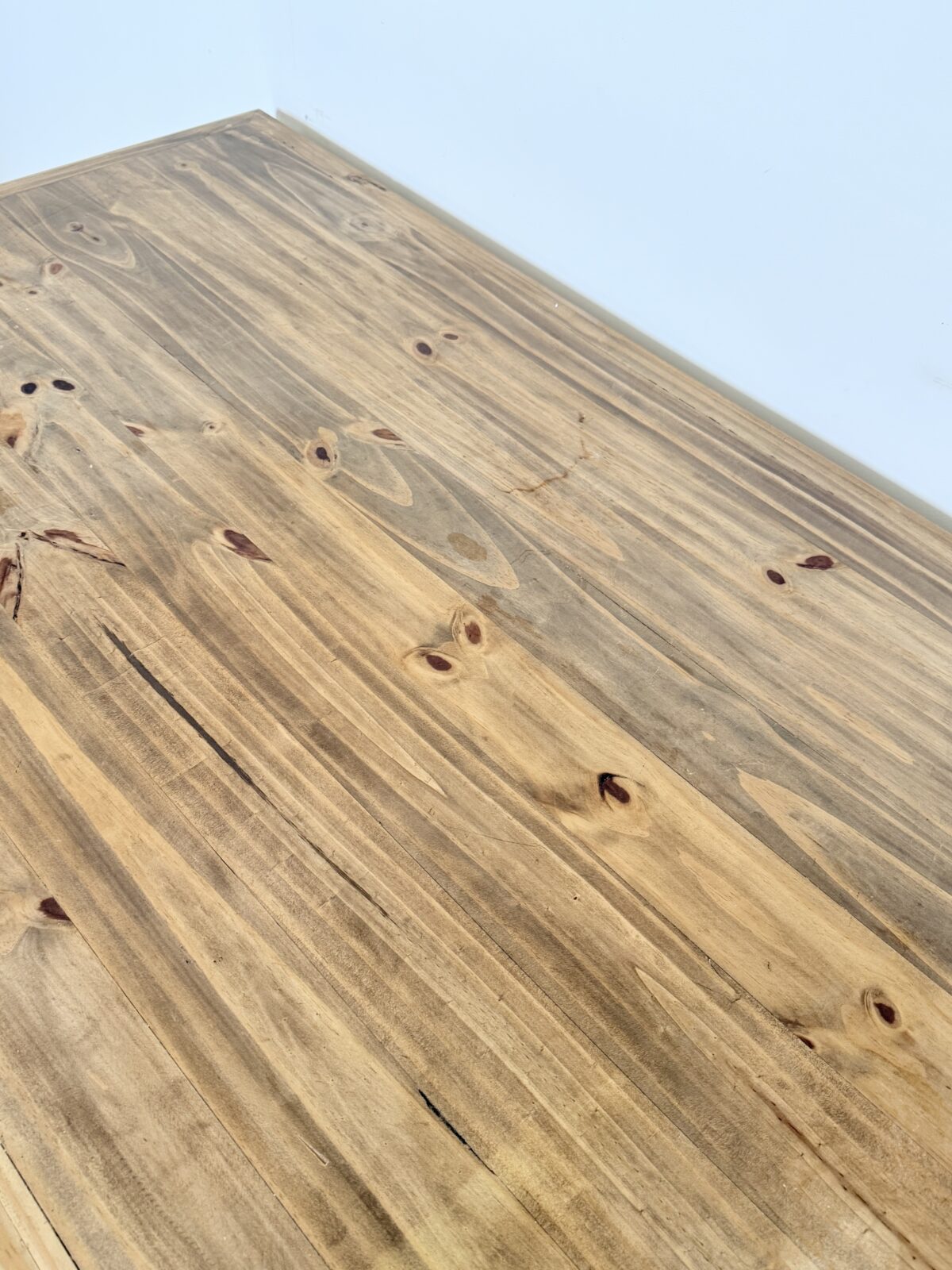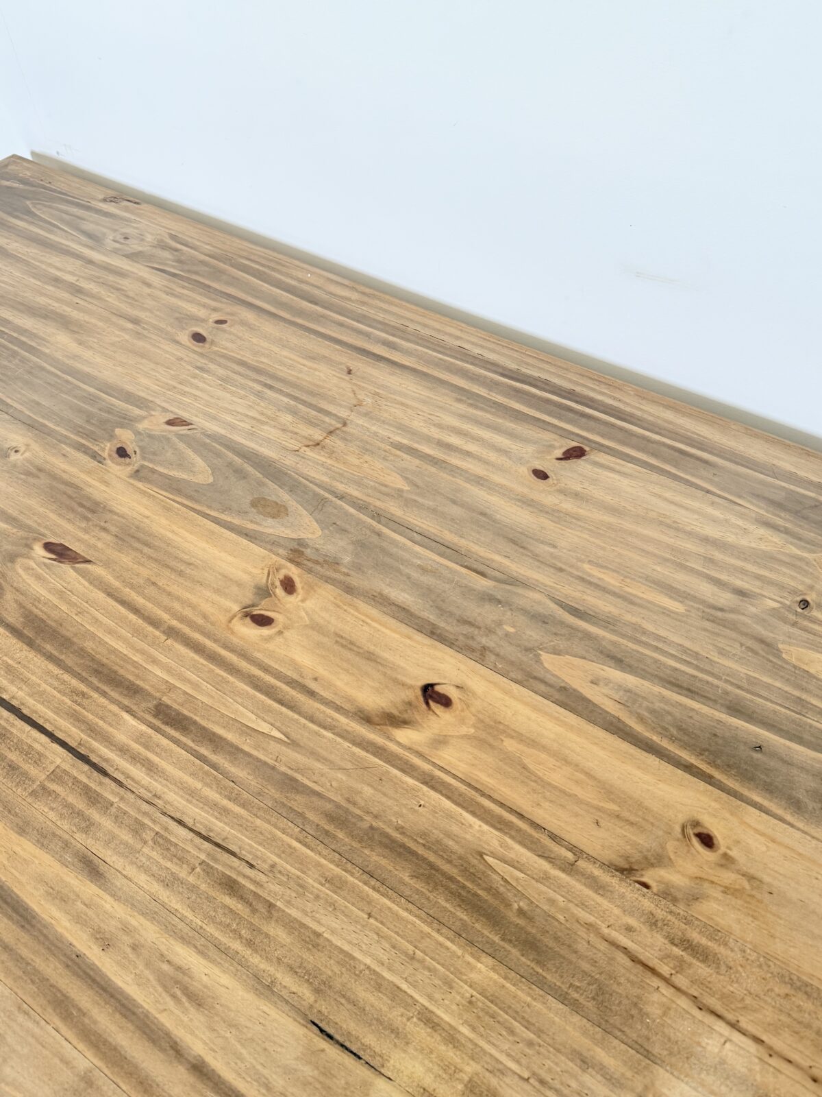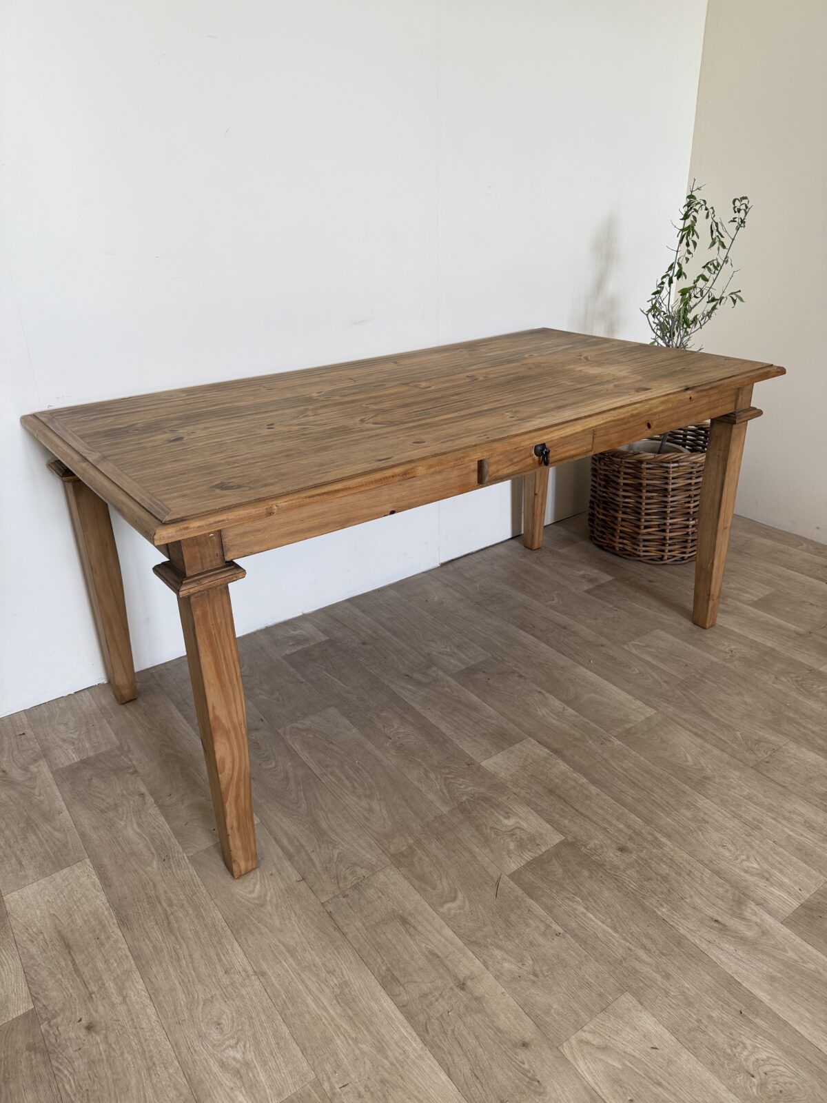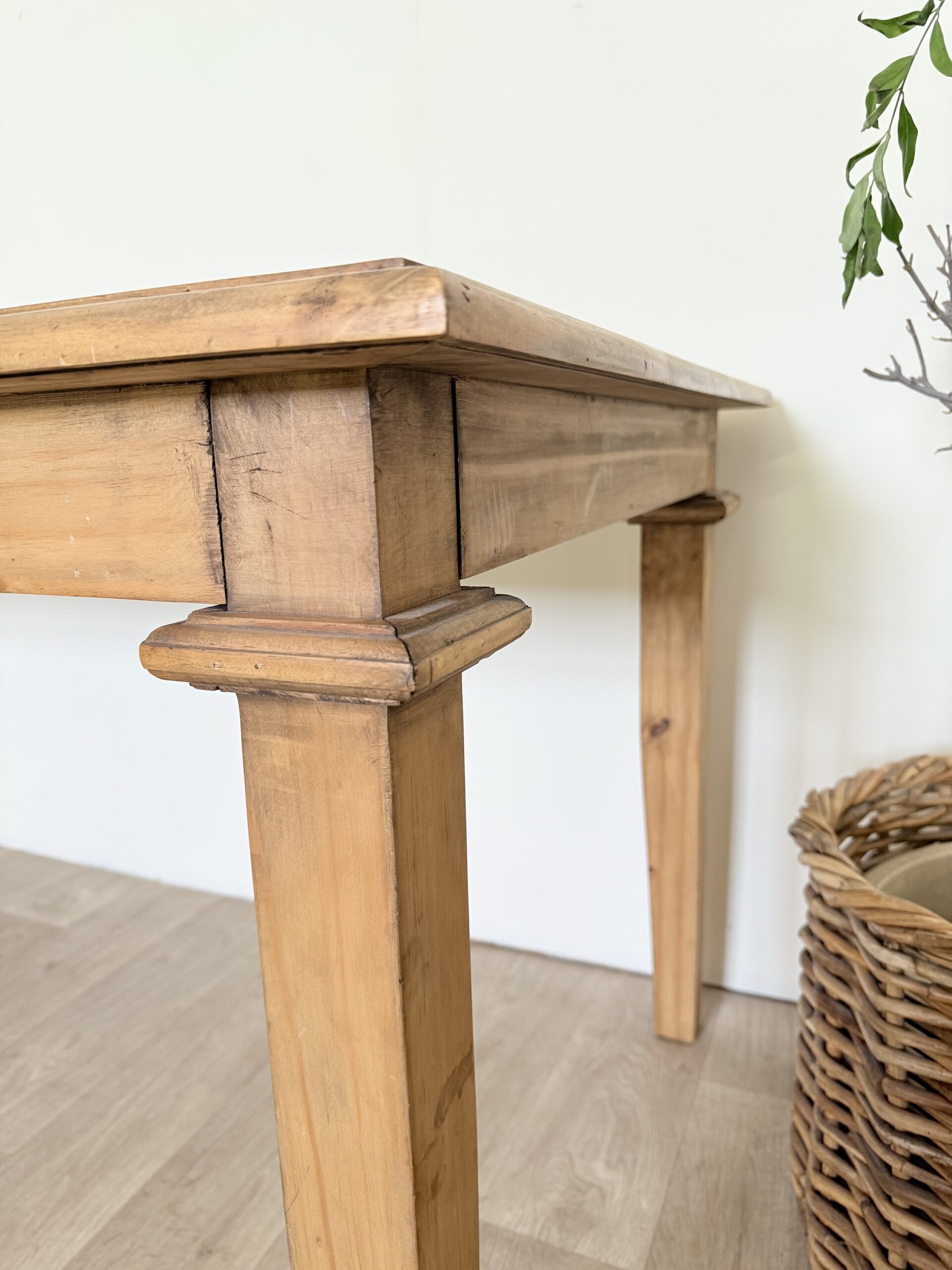 Drewniany stół wykonany z litej pini, w stylu rustykalnym farmhouse. Blat nosi naturalne oznaki upływu czasu, które podkreślają jego autentyczny charakter.