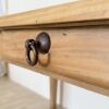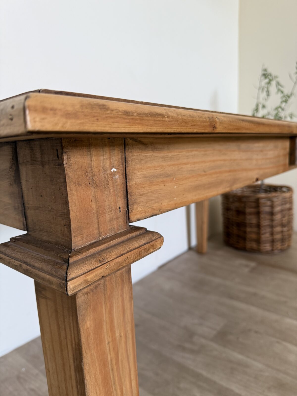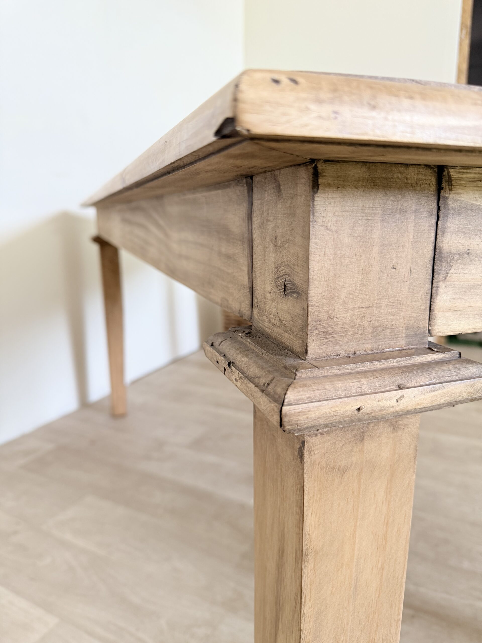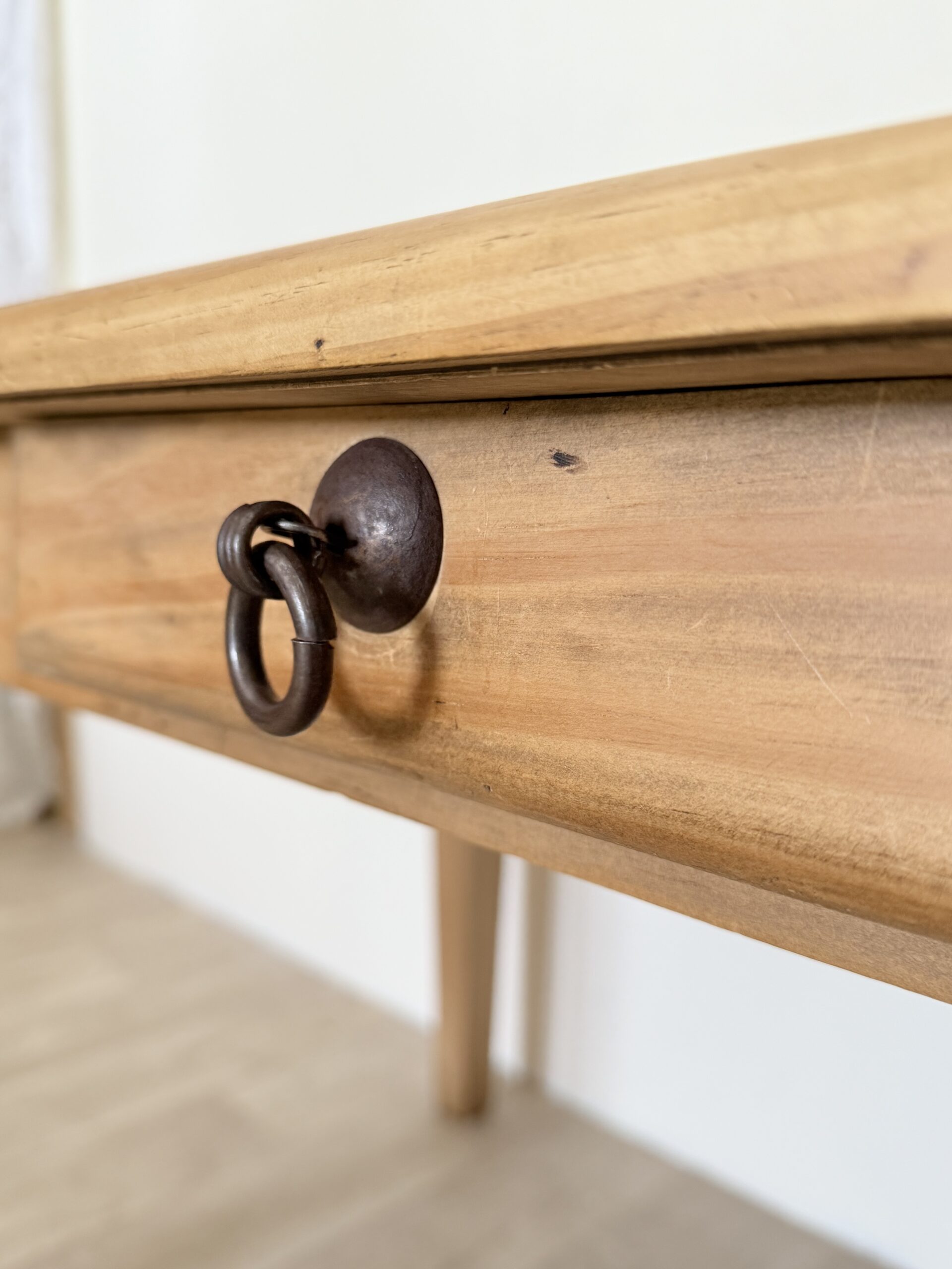 Na powierzchni widoczne są naturalne oznaki upływu czasu – subtelne przetarcia, drobne ślady użytkowania i delikatne nierówności, które świadczą o autentyczności mebla i podkreślają jego charakter. To właśnie te detale sprawiają, że stół ma duszę i niepowtarzalny klimat.