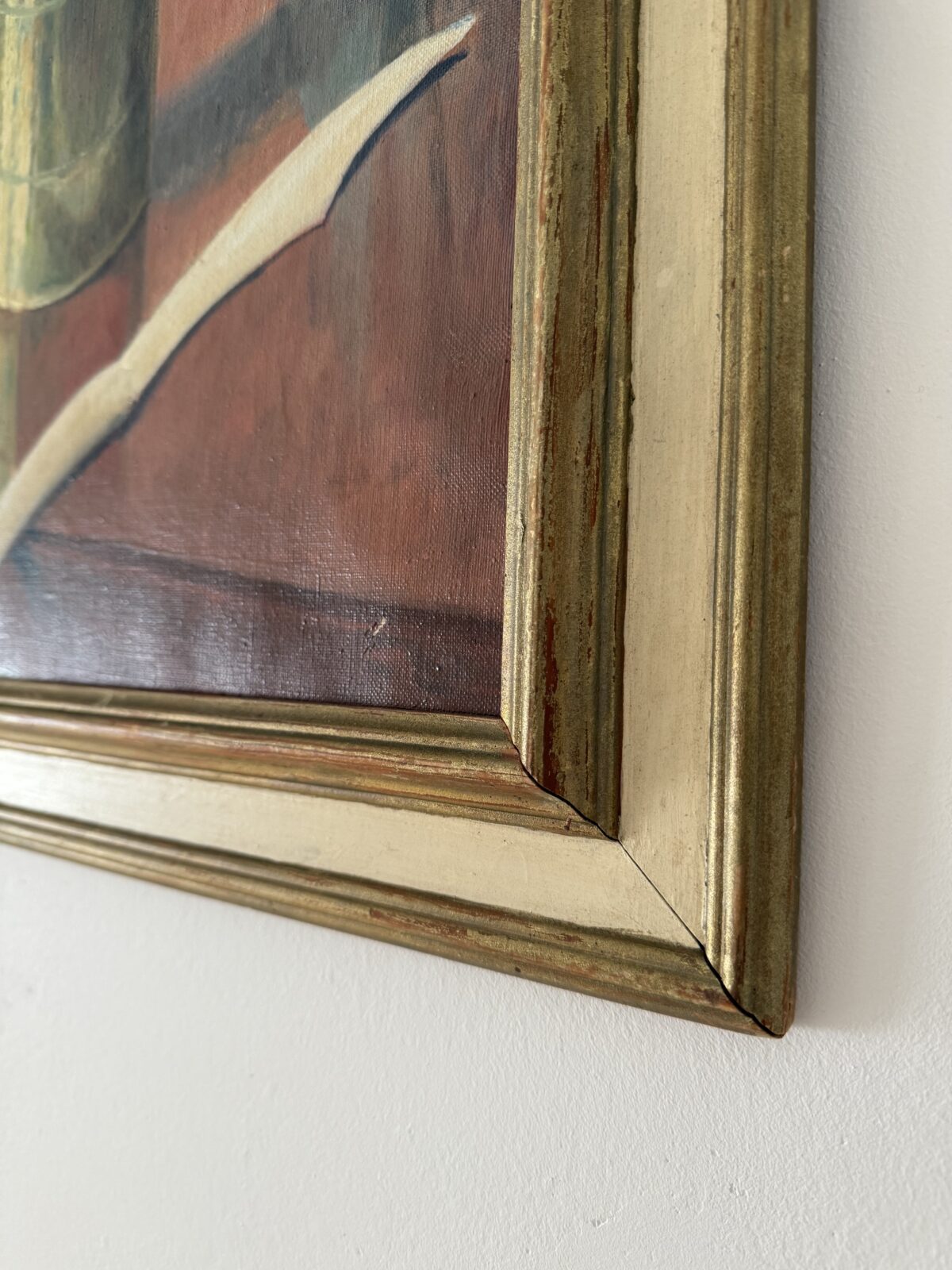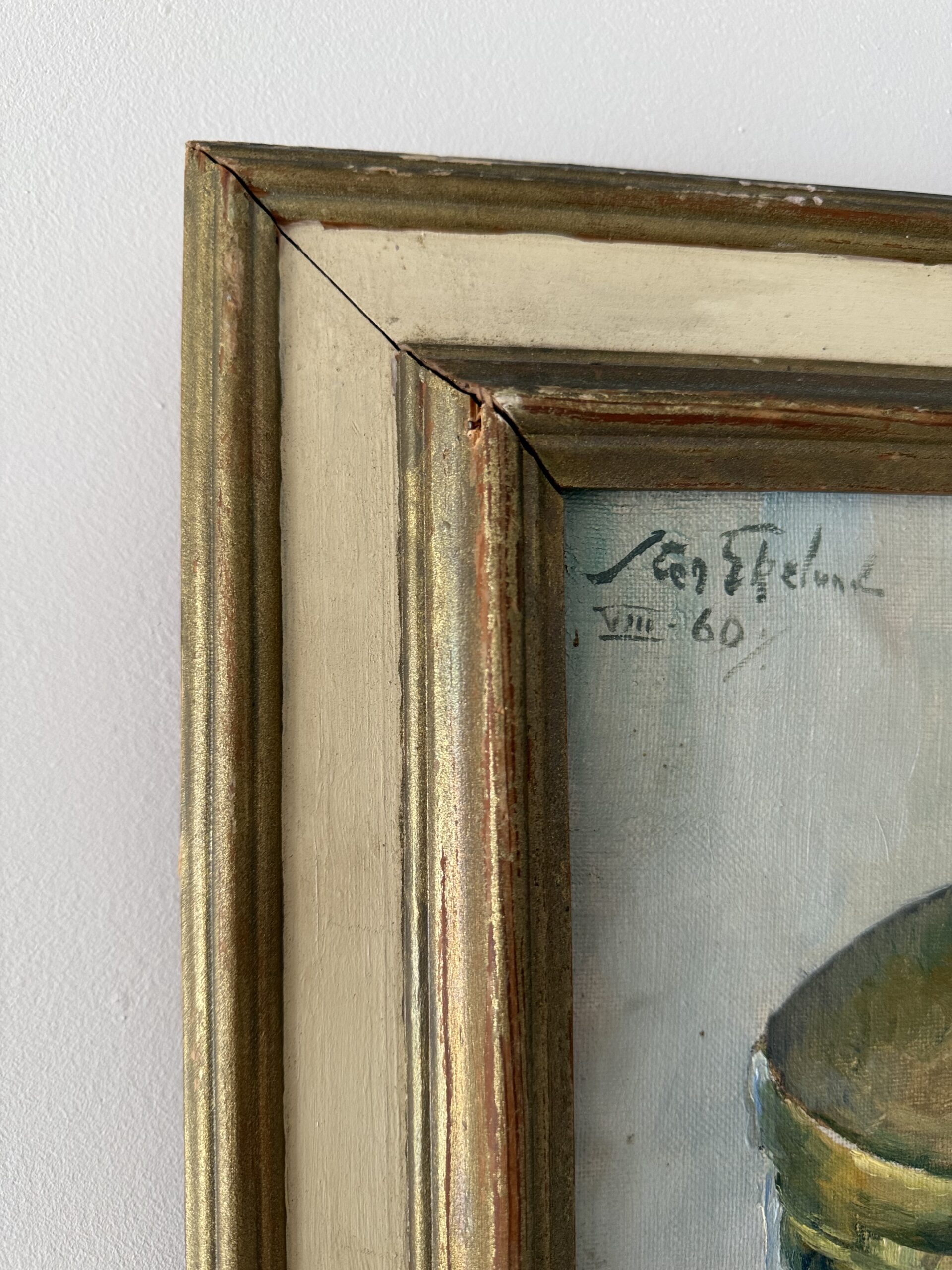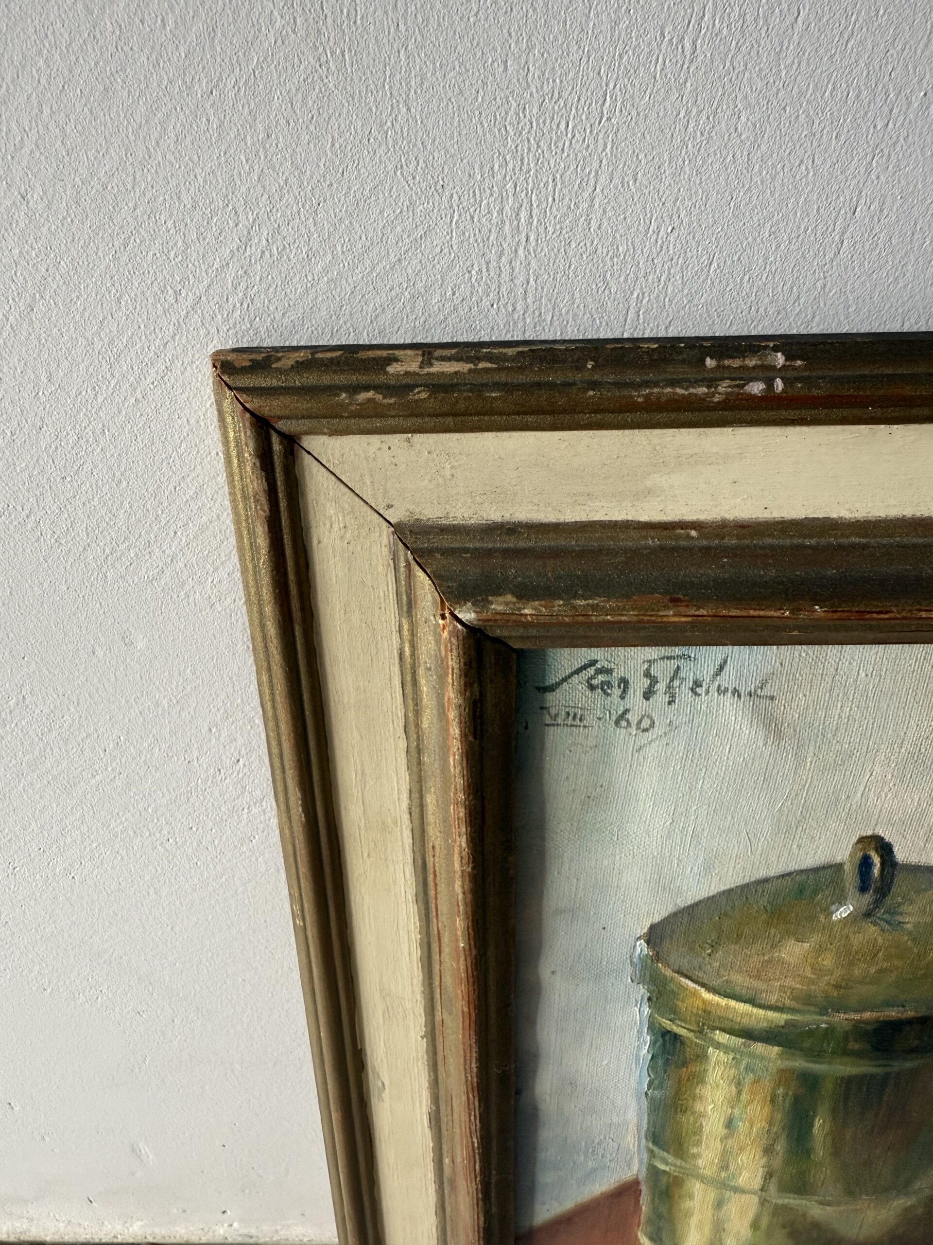 Prezentowany sygnowany obraz olejny na płótnie, datowany na 1960 rok, przedstawia klasyczną martwą naturę z metalowym pojemnikiem oraz białym nożem. Prosta, oszczędna kompozycja skupia uwagę na formie, fakturze i relacjach między przedmiotami, nadając całości elegancki, ponadczasowy charakter.