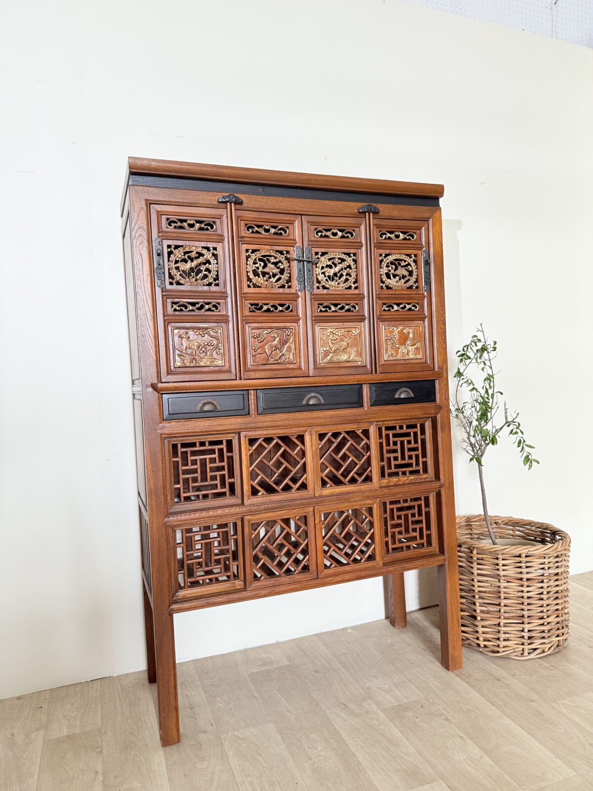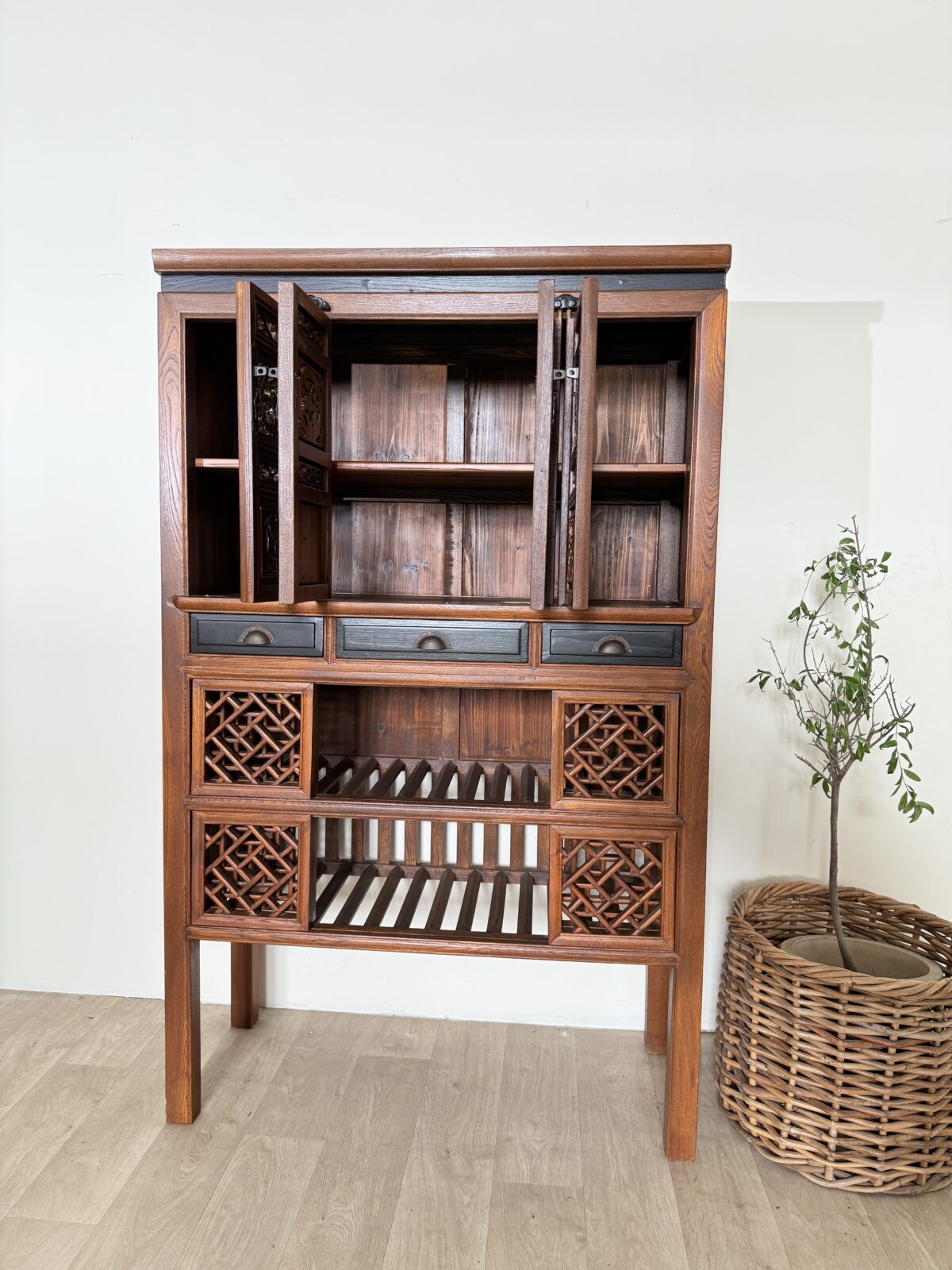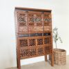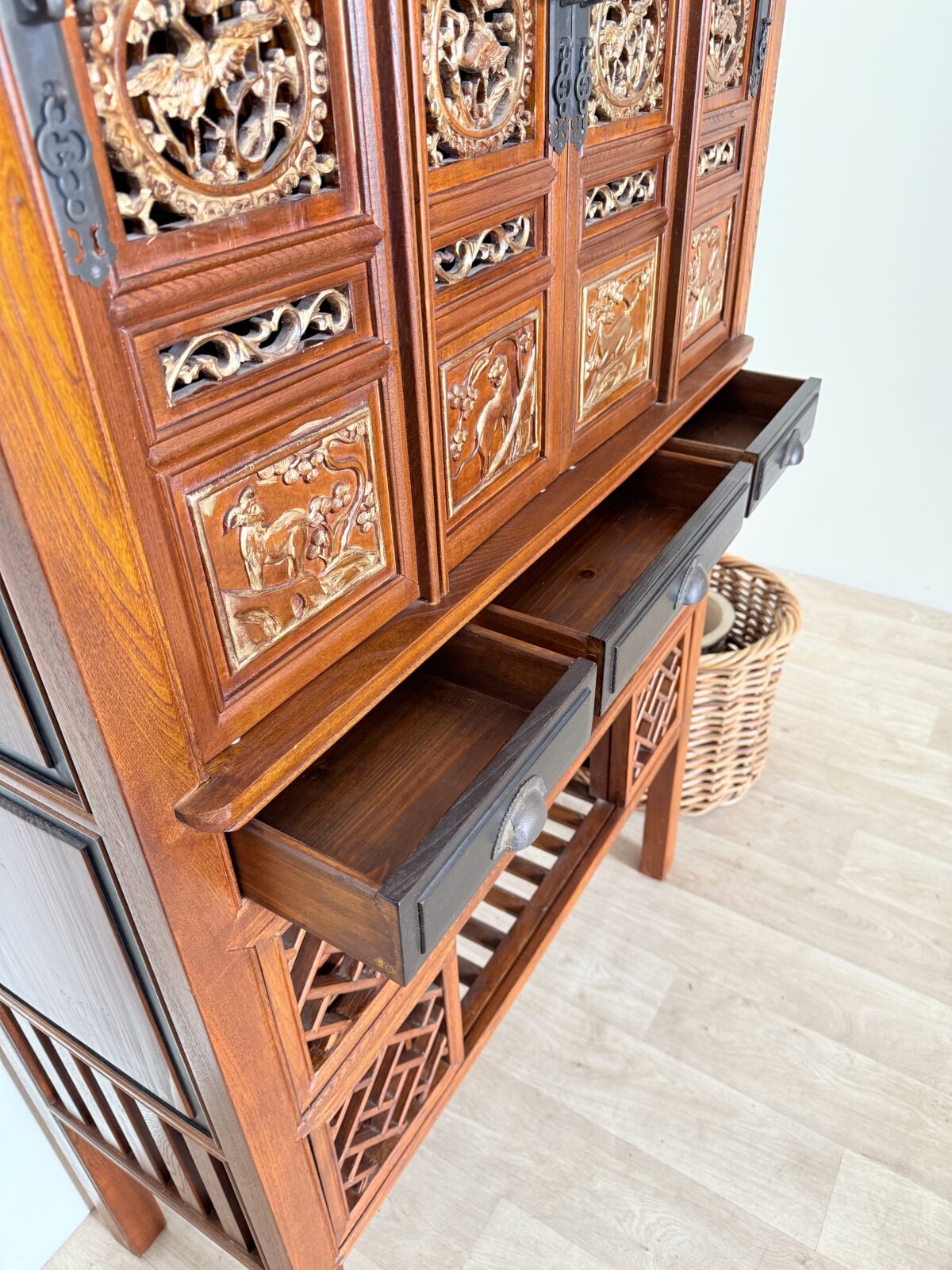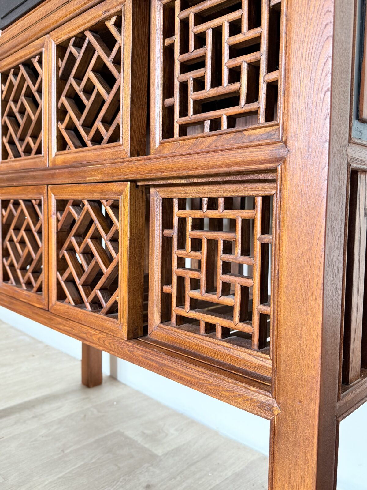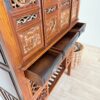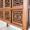 Komoda wyróżnia się dekoracyjnymi detalami oraz bogato rzeźbionymi elementami, które podkreślają jej unikalny styl inspirowany tradycyjnym chińskim rzemiosłem. Dolna część mebla posiada oryginalne ażurowe półki oraz dekoracyjne fronty, które nadają konstrukcji lekkości i jednocześnie stanowią wyjątkowy element ozdobny.