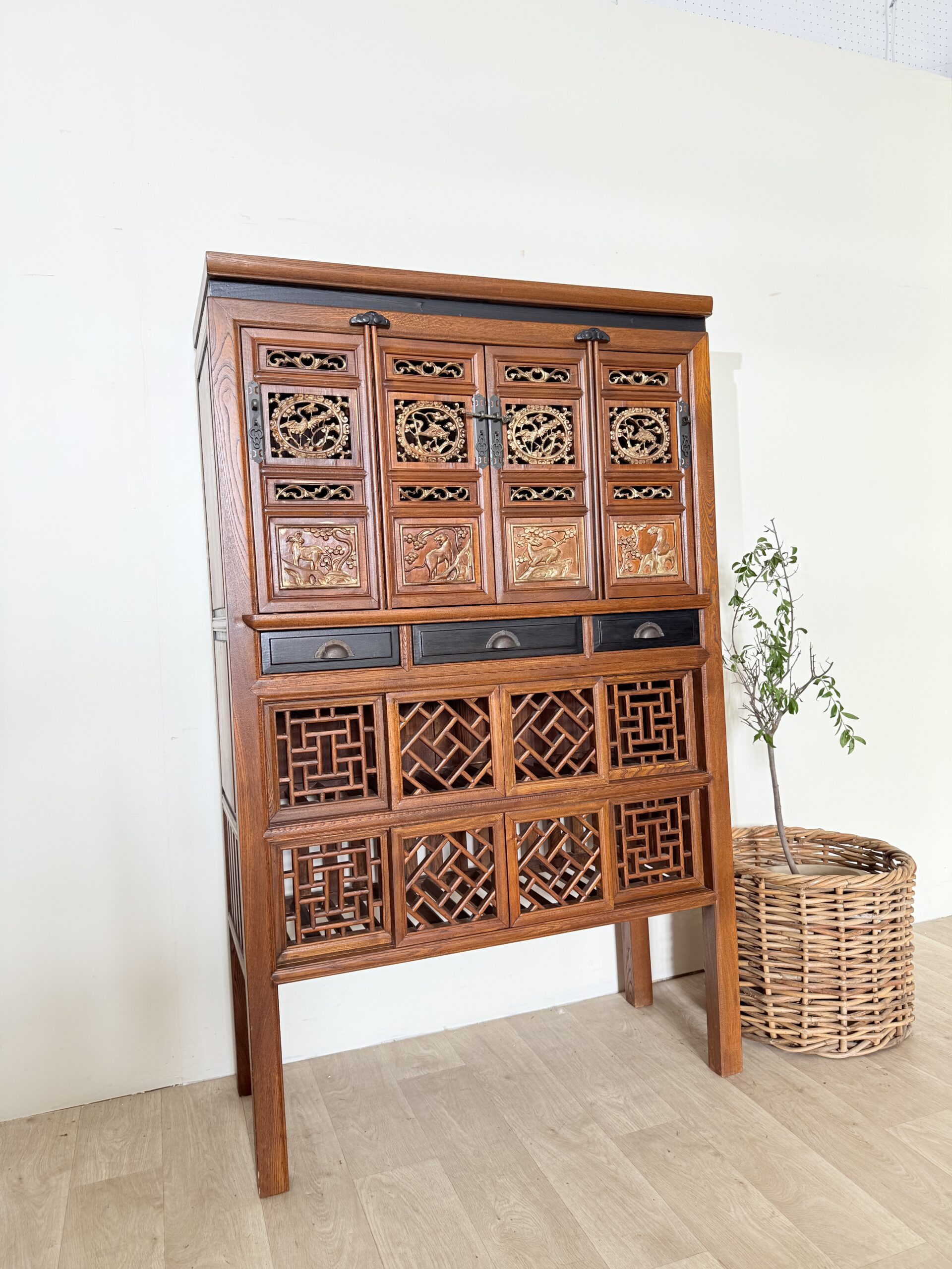 Piękna, wysoka komoda chińska w stylu vintage to wyjątkowy mebel, który zachwyca swoim orientalnym charakterem oraz starannie wykonanymi rzeźbieniami. To propozycja dla osób ceniących niepowtarzalne meble z duszą, które wprowadzają do wnętrza atmosferę egzotyki i elegancji.