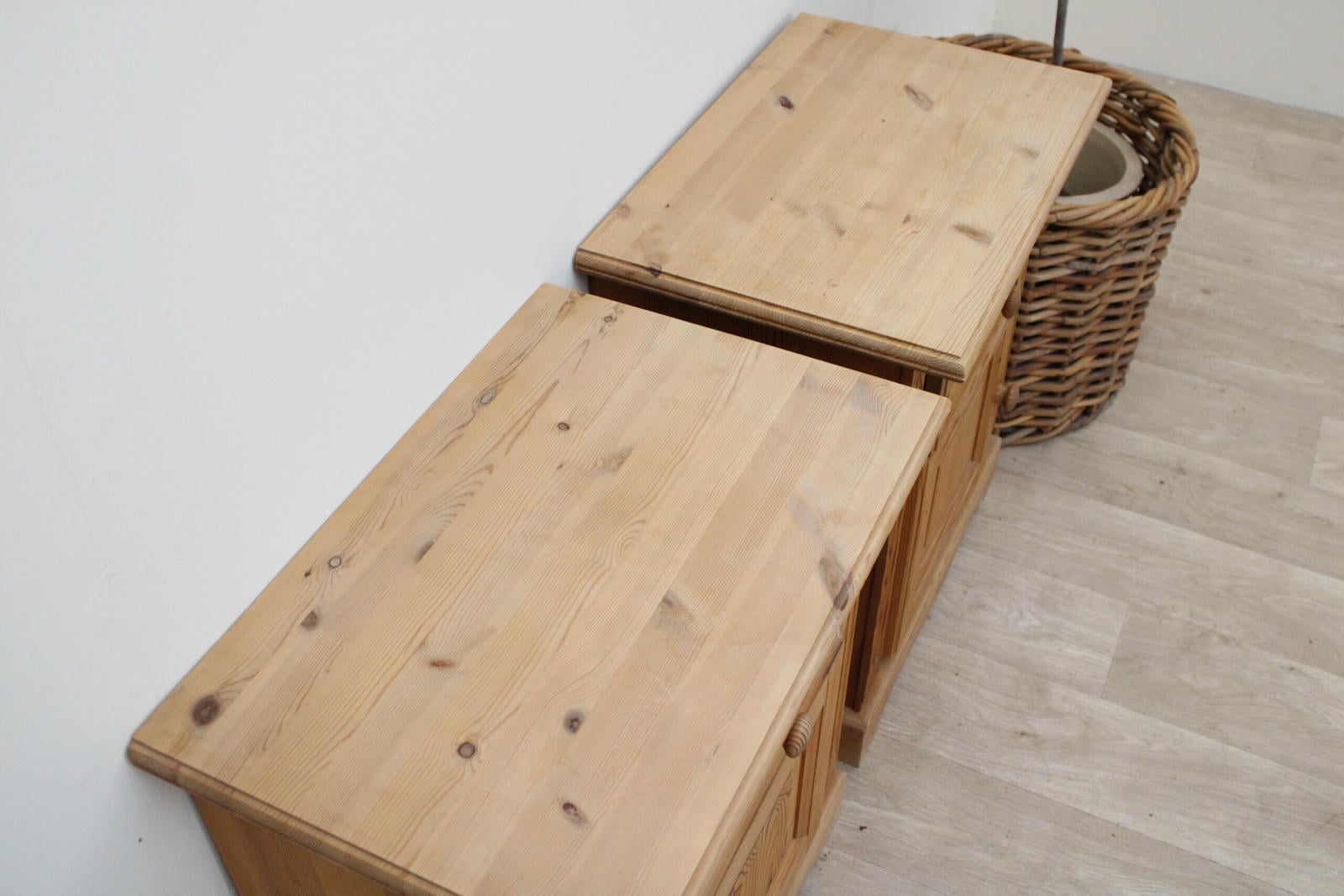 Zestaw 2 szafek nocnych z drewna sosnowego – vintage, naturalne, z dusząZestaw 2 szafek nocnych z drewna sosnowego – vintage, naturalne, z duszą