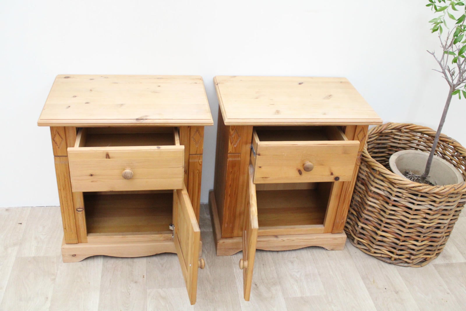 Zestaw dwóch szafek nocnych z drewna sosnowego – klasycznych, naturalnych i przytulnych. Blaty oraz fronty wykonane z litego drewna, boki z płyty meblowej. Idealne do sypialni w stylu vintage, rustykalnym lub klasycznym.
