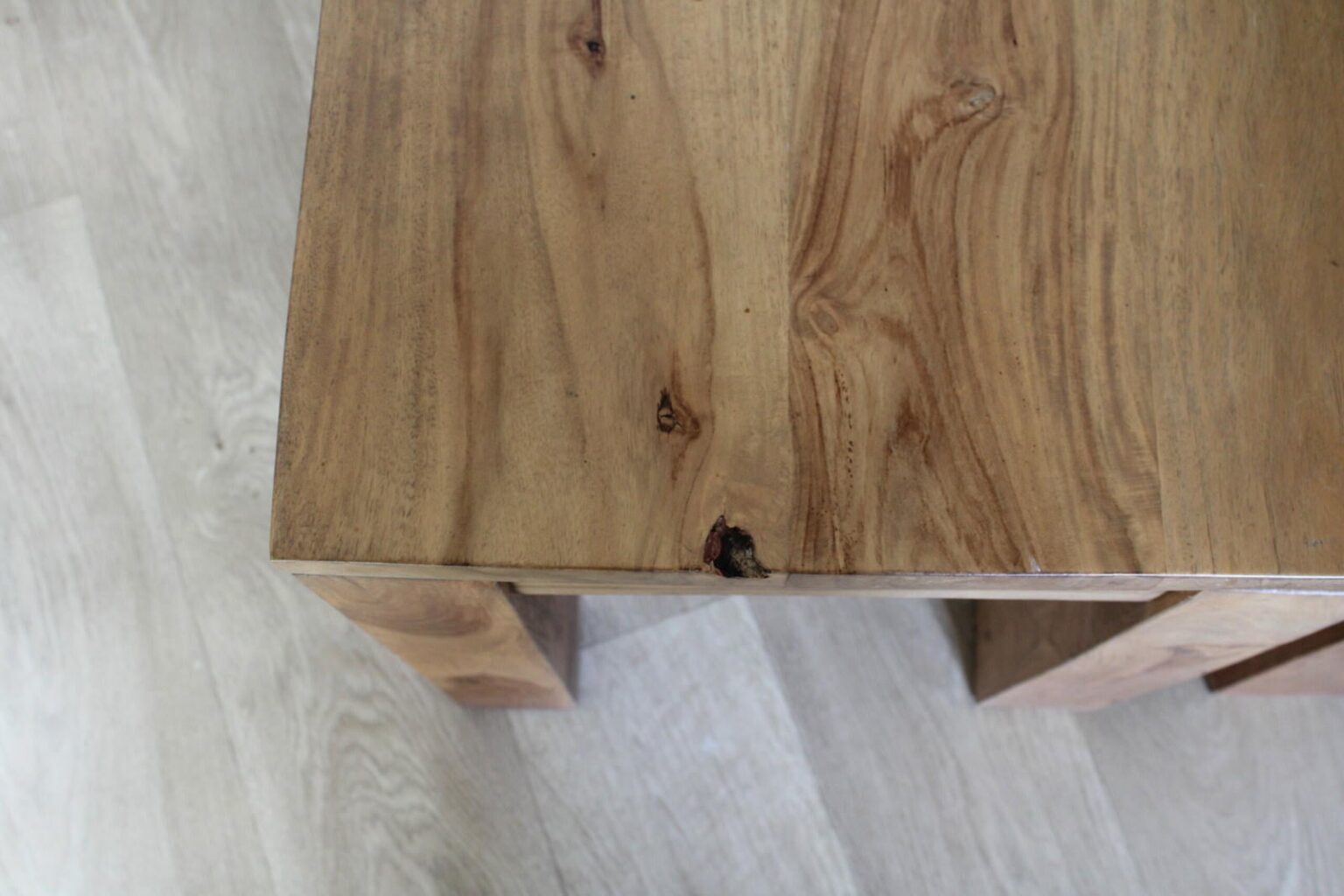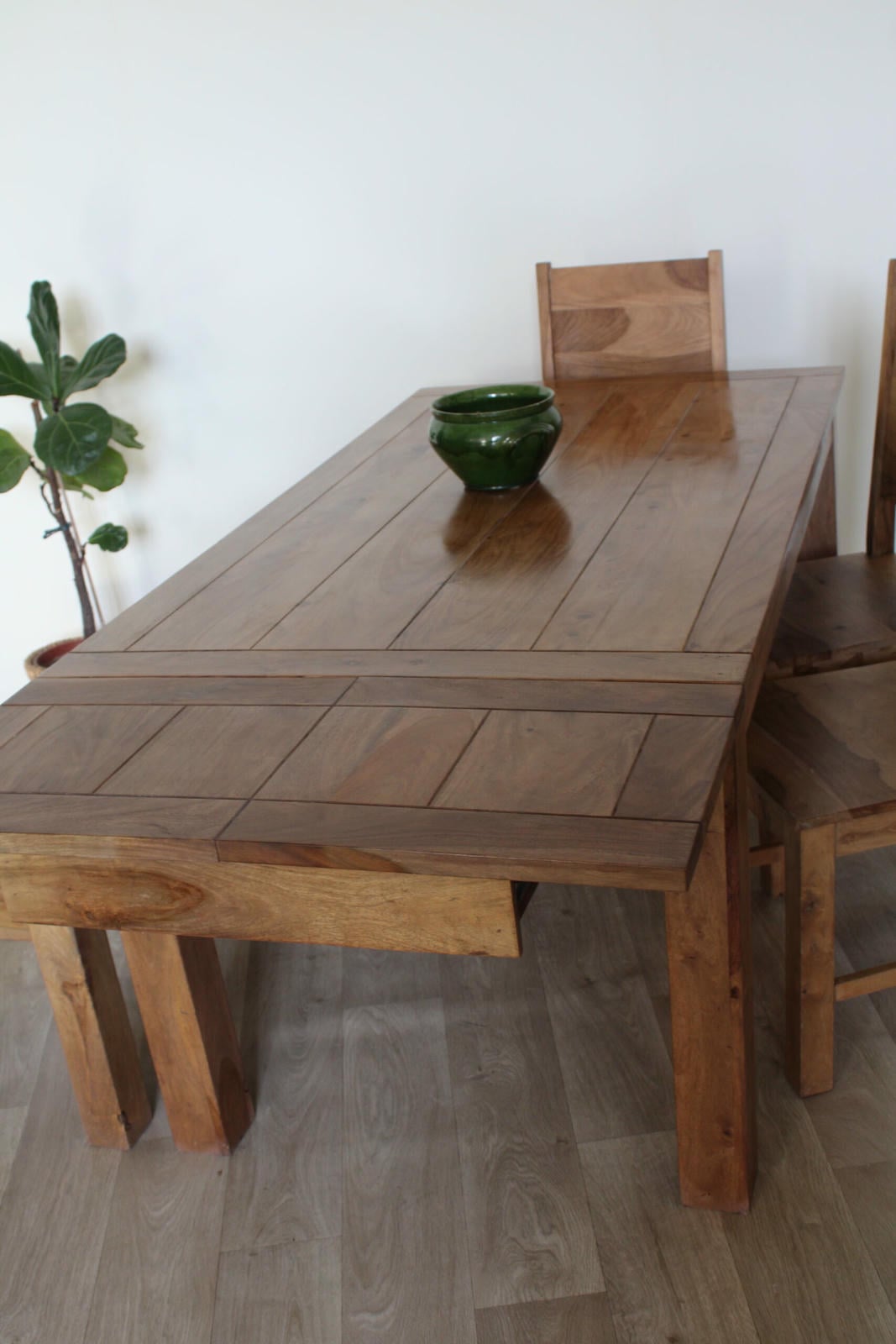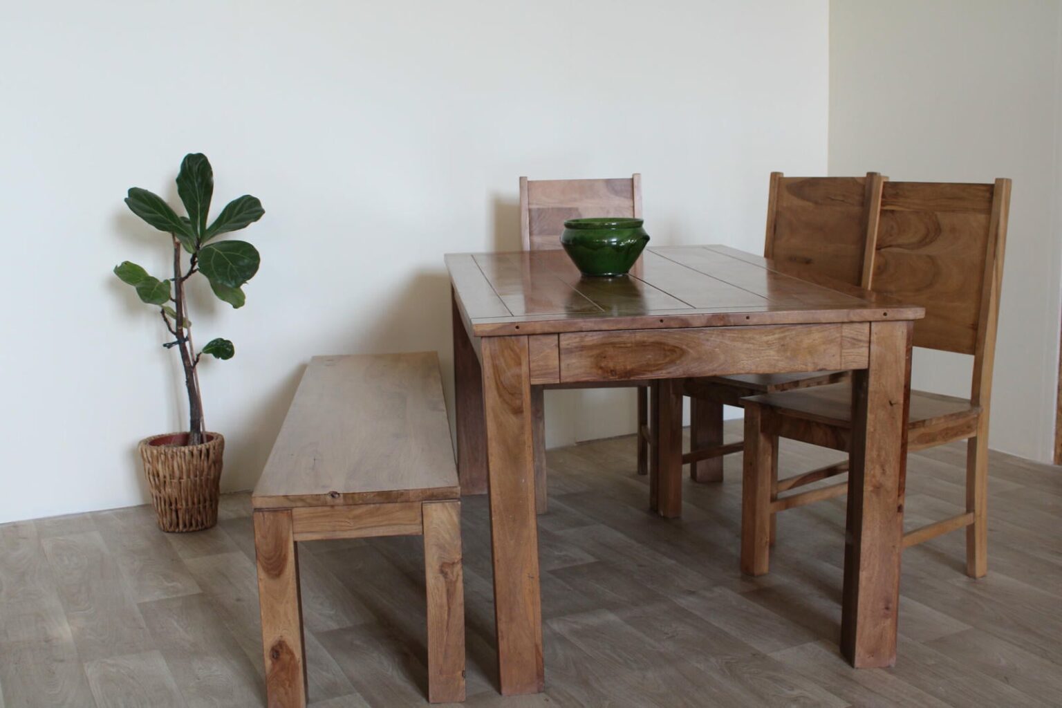 Ten zestaw do jadalni z litego drewna egzotycznego to połączenie naturalnego piękna, solidnego rzemiosła i ponadczasowego stylu. Wykonany w całości z drewna palisandrowego (w naturalnym, surowym wykończeniu), zachwyca głębokim kolorem i organiczną strukturą.