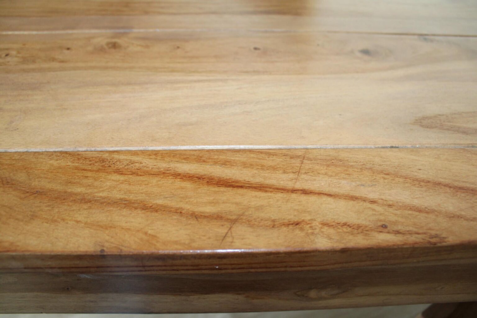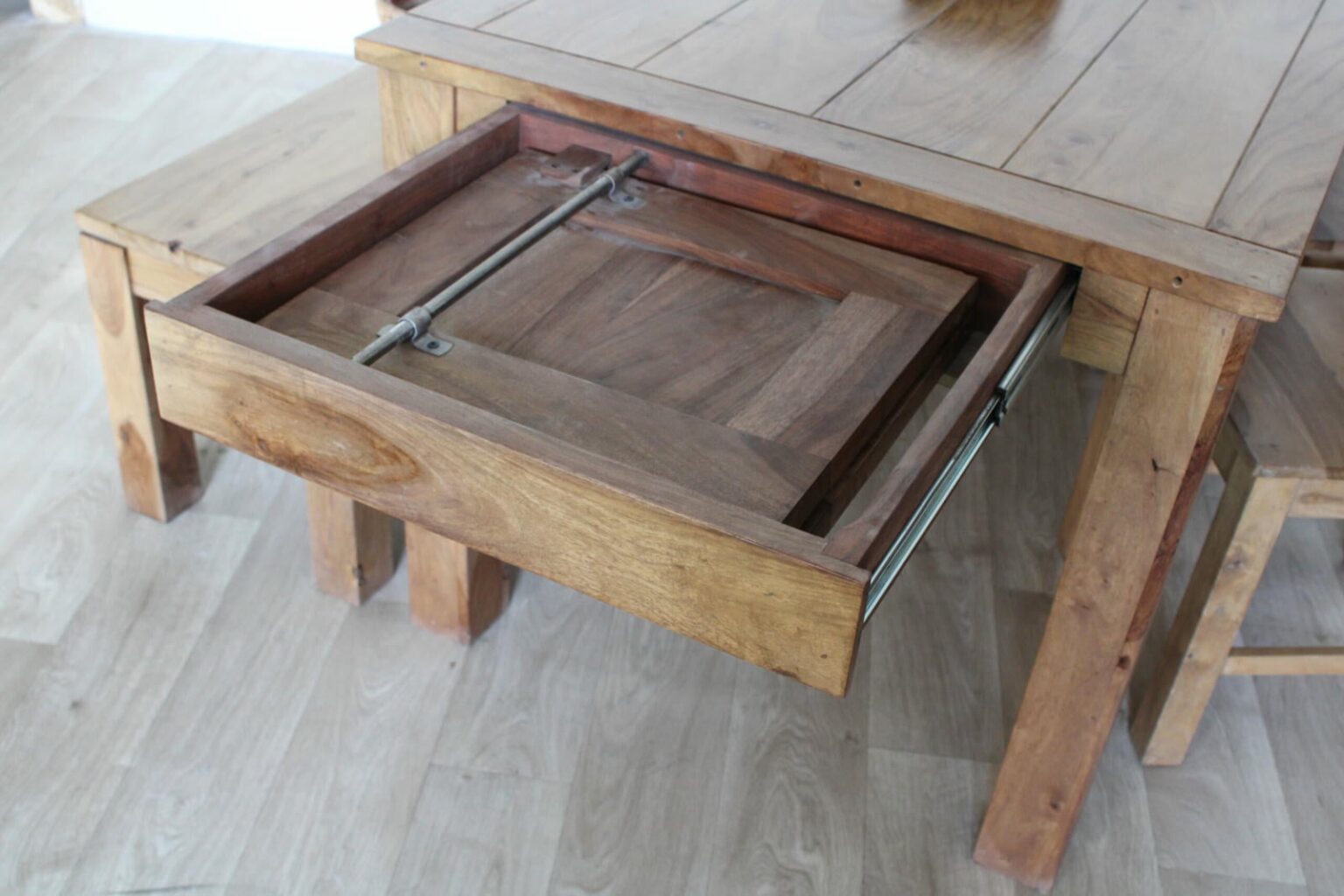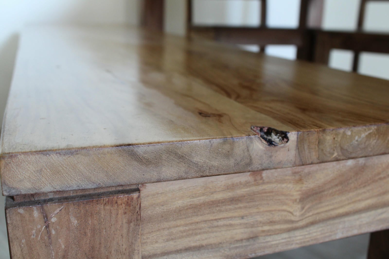 Ten zestaw do jadalni z litego drewna egzotycznego to połączenie naturalnego piękna, solidnego rzemiosła i ponadczasowego stylu. Wykonany w całości z drewna palisandrowego (w naturalnym, surowym wykończeniu), zachwyca głębokim kolorem i organiczną strukturą.