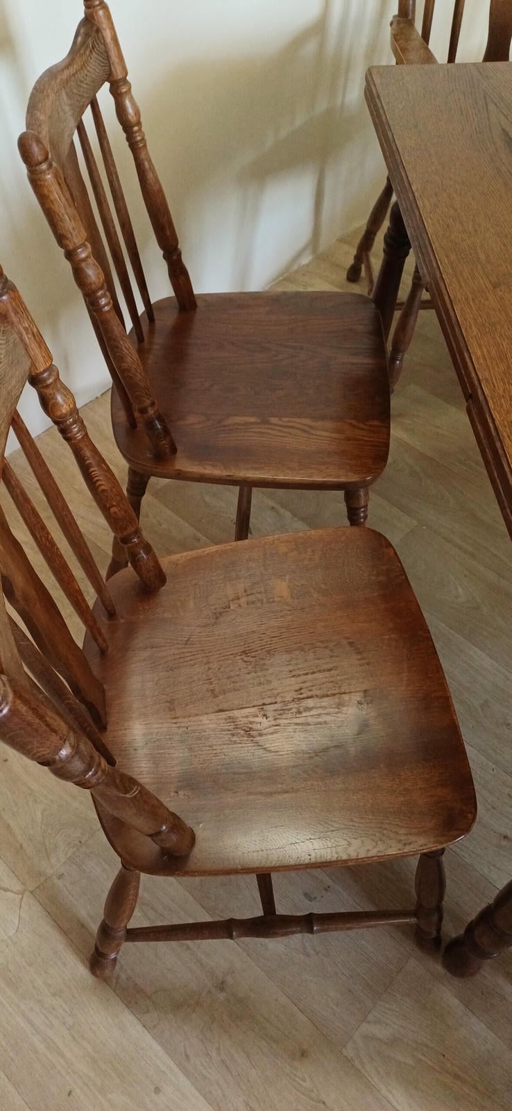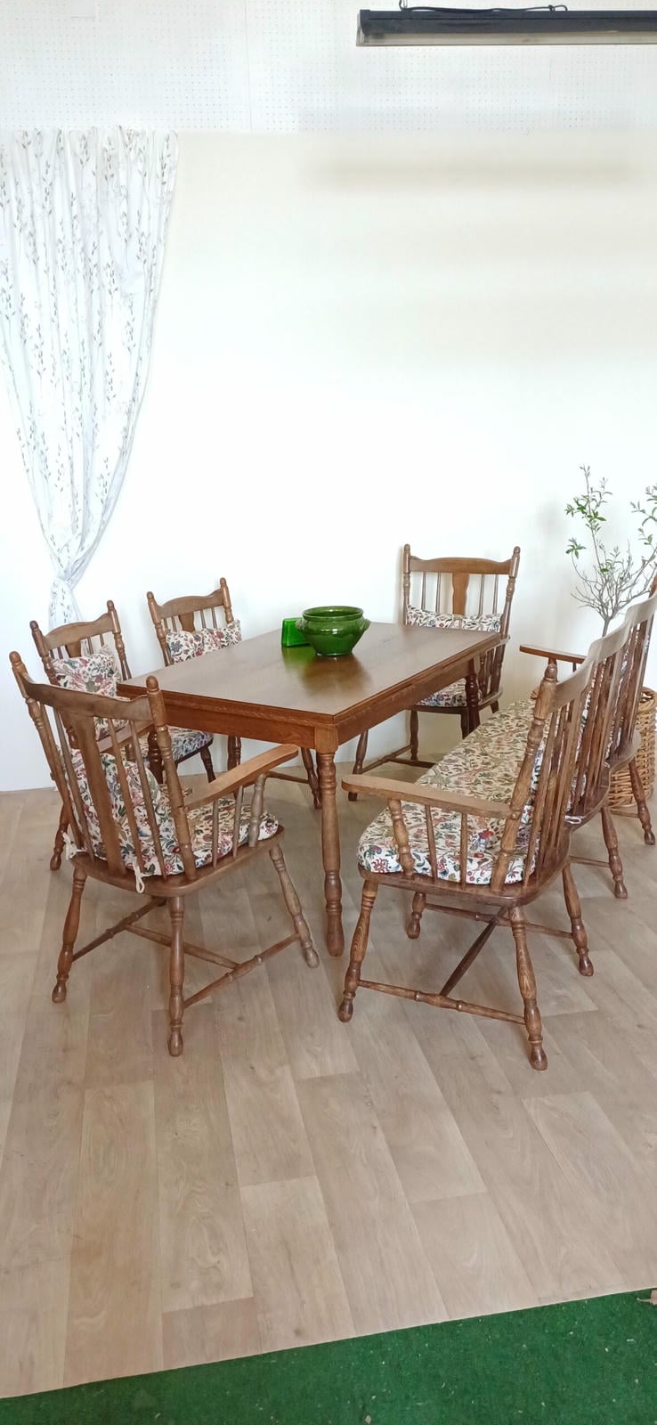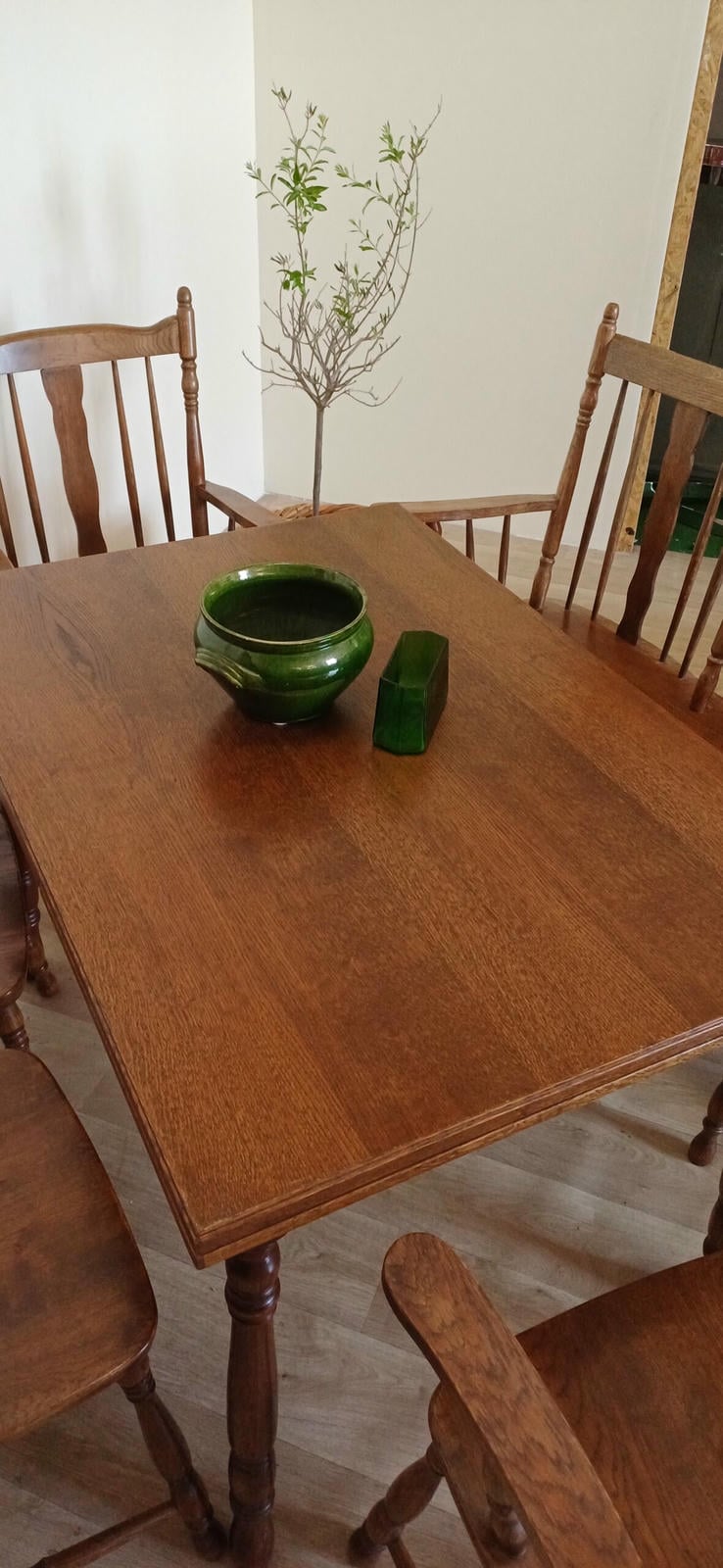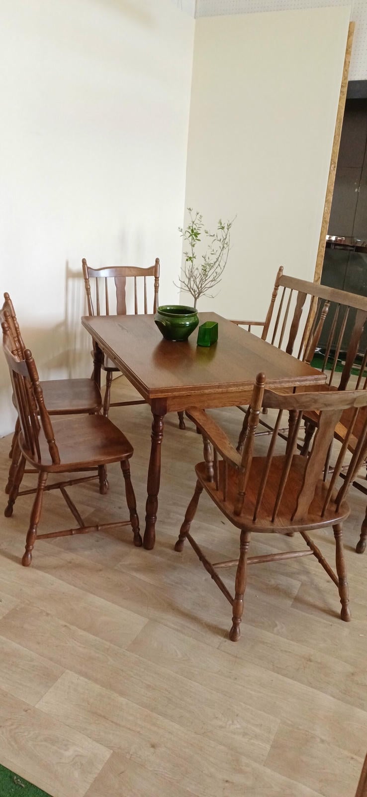 Stół z fornirowanym blatem zachwyca naturalnym  odcieniem dębu, doskonale komponując się z prostotą i lekkością drewnianych krzeseł oraz minimalistyczną formą ławki. Całość tworzy harmonijny zestaw, który wnosi do wnętrza spokój, przytulność i ponadczasową elegancję. Meble zostały starannie odnowione, z poszanowaniem ich oryginalnego stylu i struktury drewna, dzięki czemu zachowują swój autentyczny, retro charakter, a jednocześnie są gotowe do dalszego użytkowania przez długie lata.