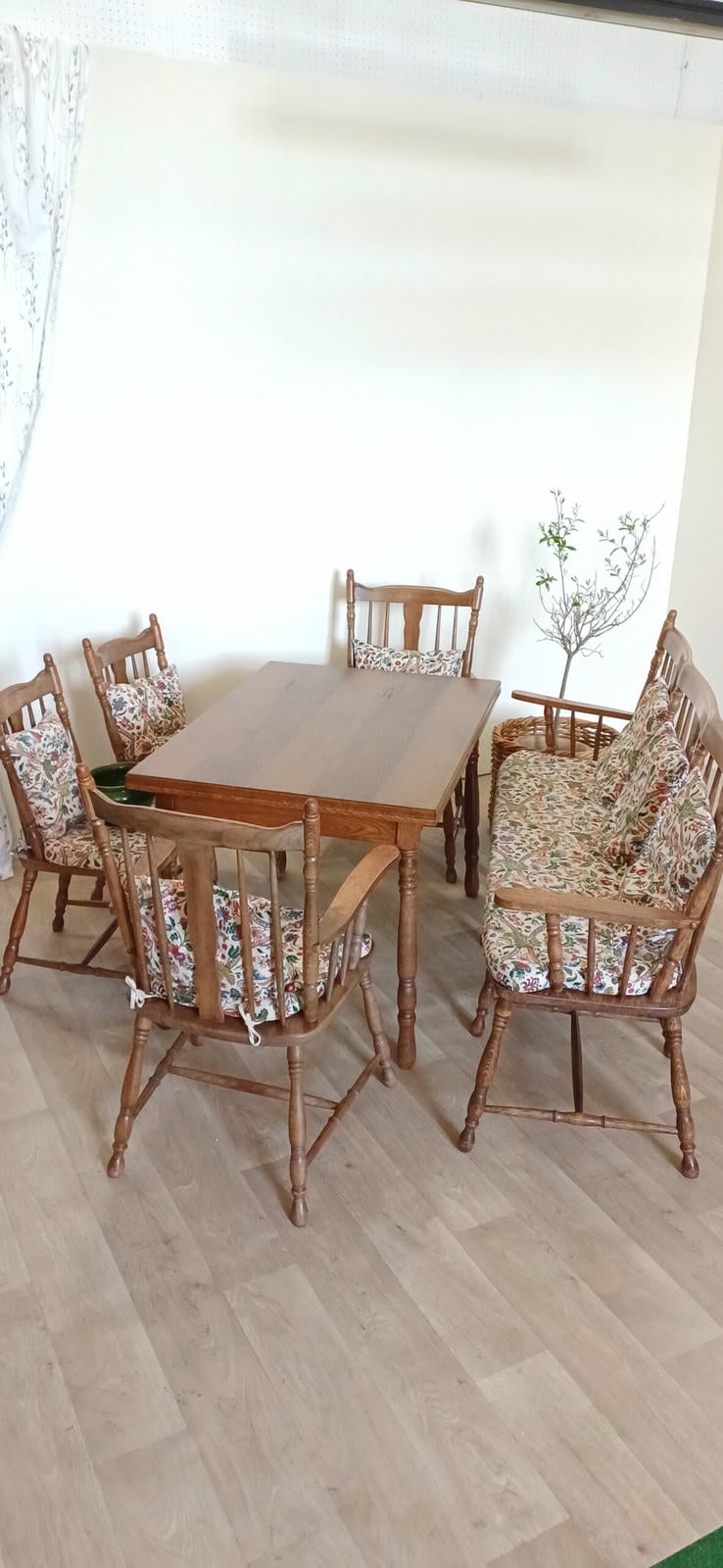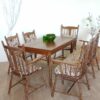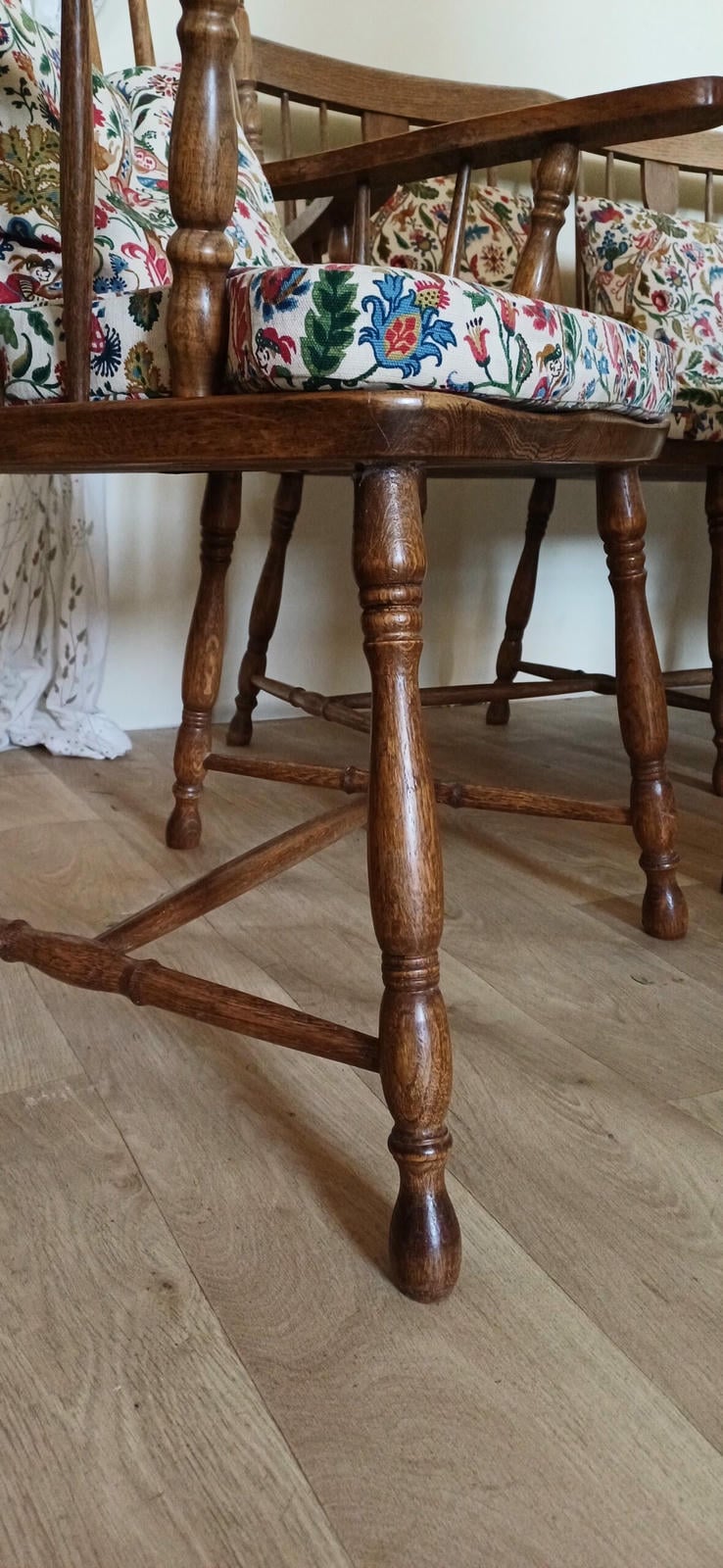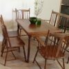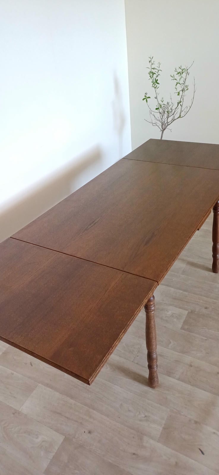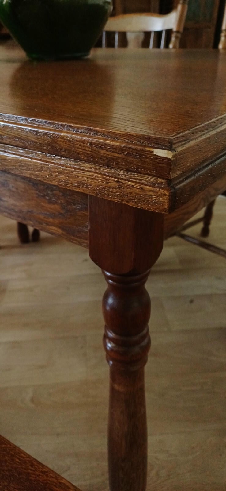 Stół z fornirowanym blatem zachwyca naturalnym  odcieniem dębu, doskonale komponując się z prostotą i lekkością drewnianych krzeseł oraz minimalistyczną formą ławki. Całość tworzy harmonijny zestaw, który wnosi do wnętrza spokój, przytulność i ponadczasową elegancję. Meble zostały starannie odnowione, z poszanowaniem ich oryginalnego stylu i struktury drewna, dzięki czemu zachowują swój autentyczny, retro charakter, a jednocześnie są gotowe do dalszego użytkowania przez długie lata.