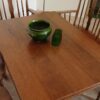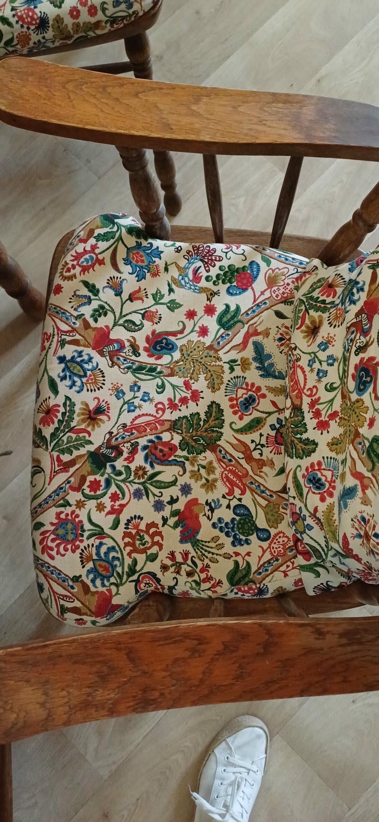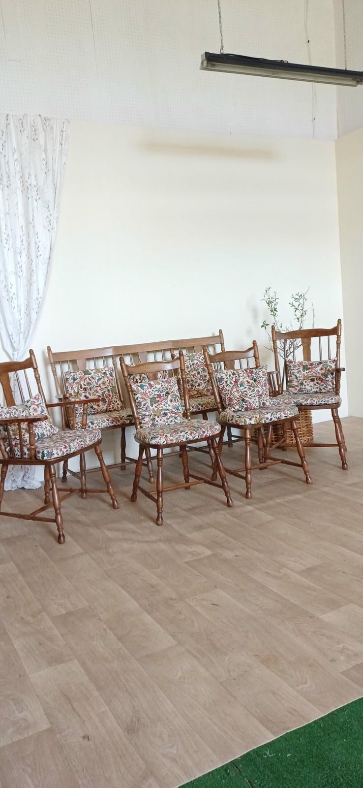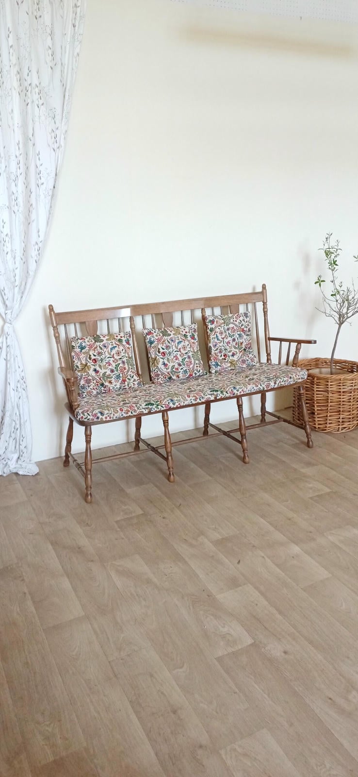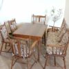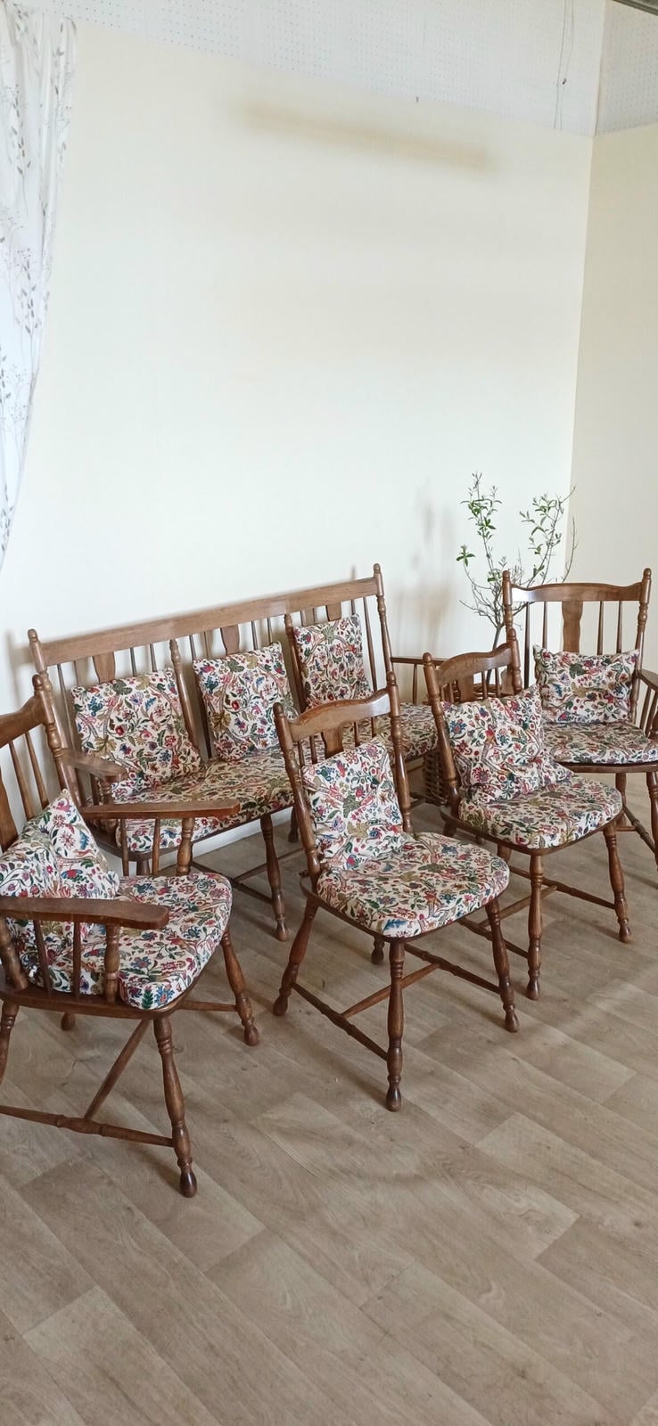 Stół z fornirowanym blatem zachwyca naturalnym  odcieniem dębu, doskonale komponując się z prostotą i lekkością drewnianych krzeseł oraz minimalistyczną formą ławki. Całość tworzy harmonijny zestaw, który wnosi do wnętrza spokój, przytulność i ponadczasową elegancję. Meble zostały starannie odnowione, z poszanowaniem ich oryginalnego stylu i struktury drewna, dzięki czemu zachowują swój autentyczny, retro charakter, a jednocześnie są gotowe do dalszego użytkowania przez długie lata.