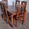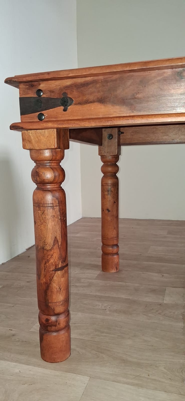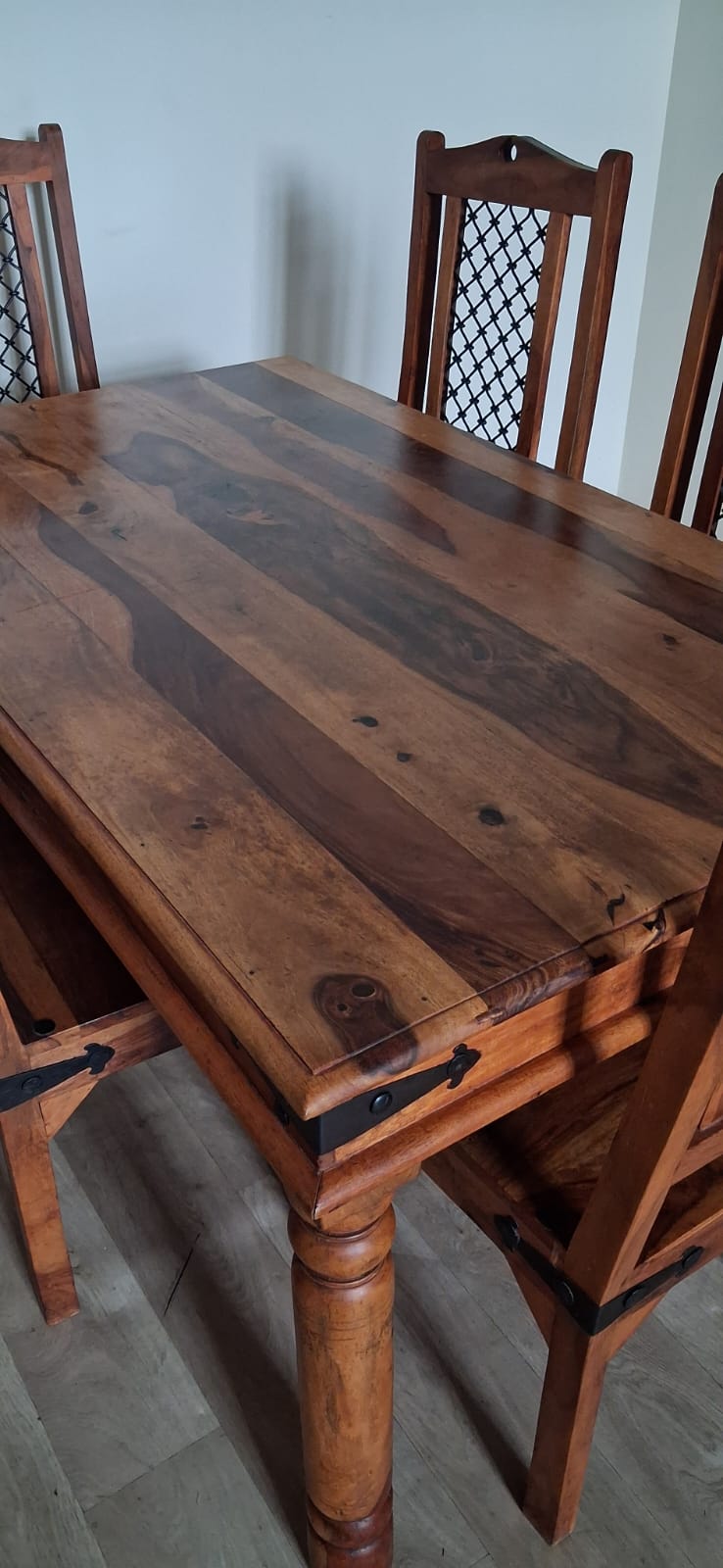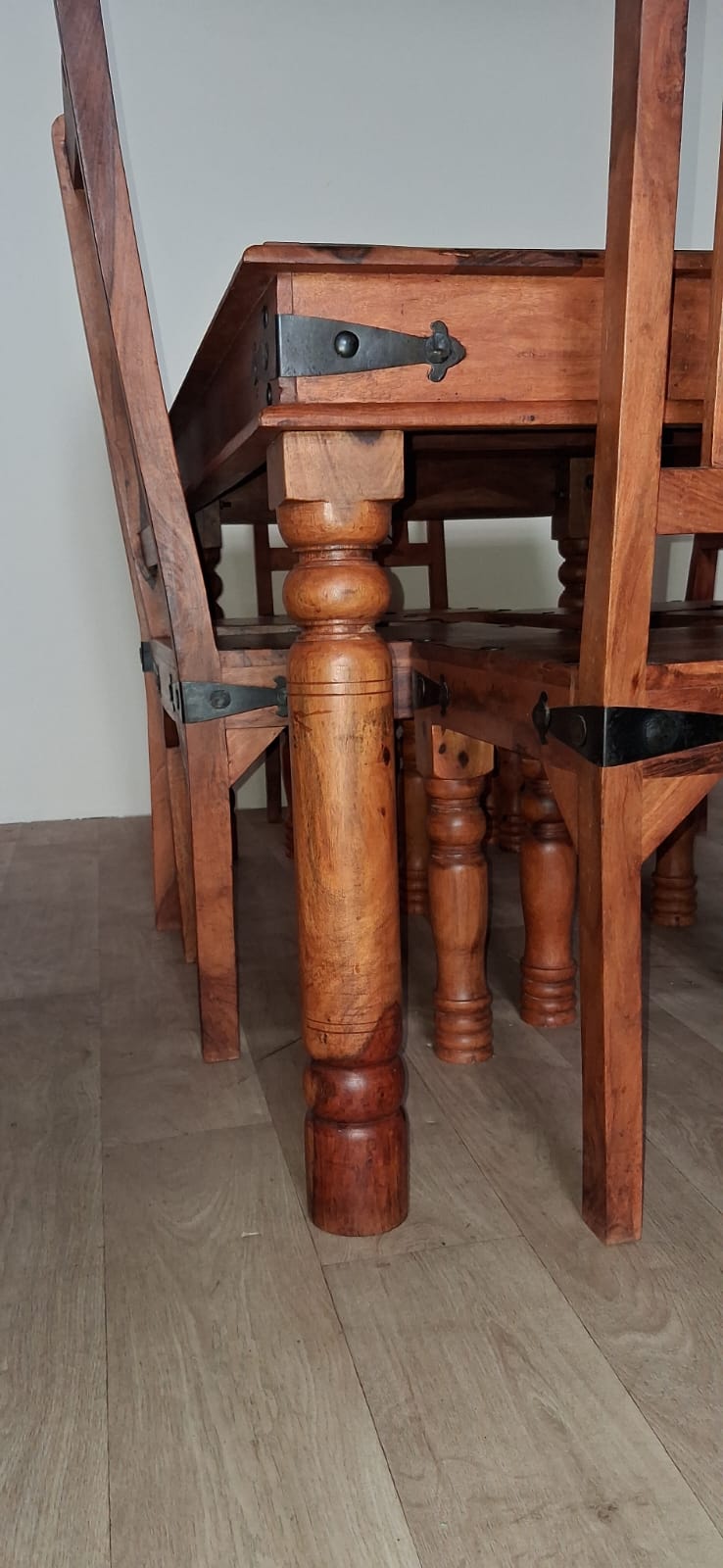 Stylowy zestaw mebli kolonialnych wykonany z litego drewna z elementami metaloplastyki. Komplet łączy naturalne piękno, solidność i wyjątkowy charakter – idealny do jadalni, salonu lub przestrzeni w stylu kolonialnym, rustykalnym czy boho.