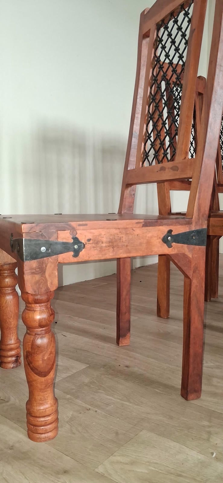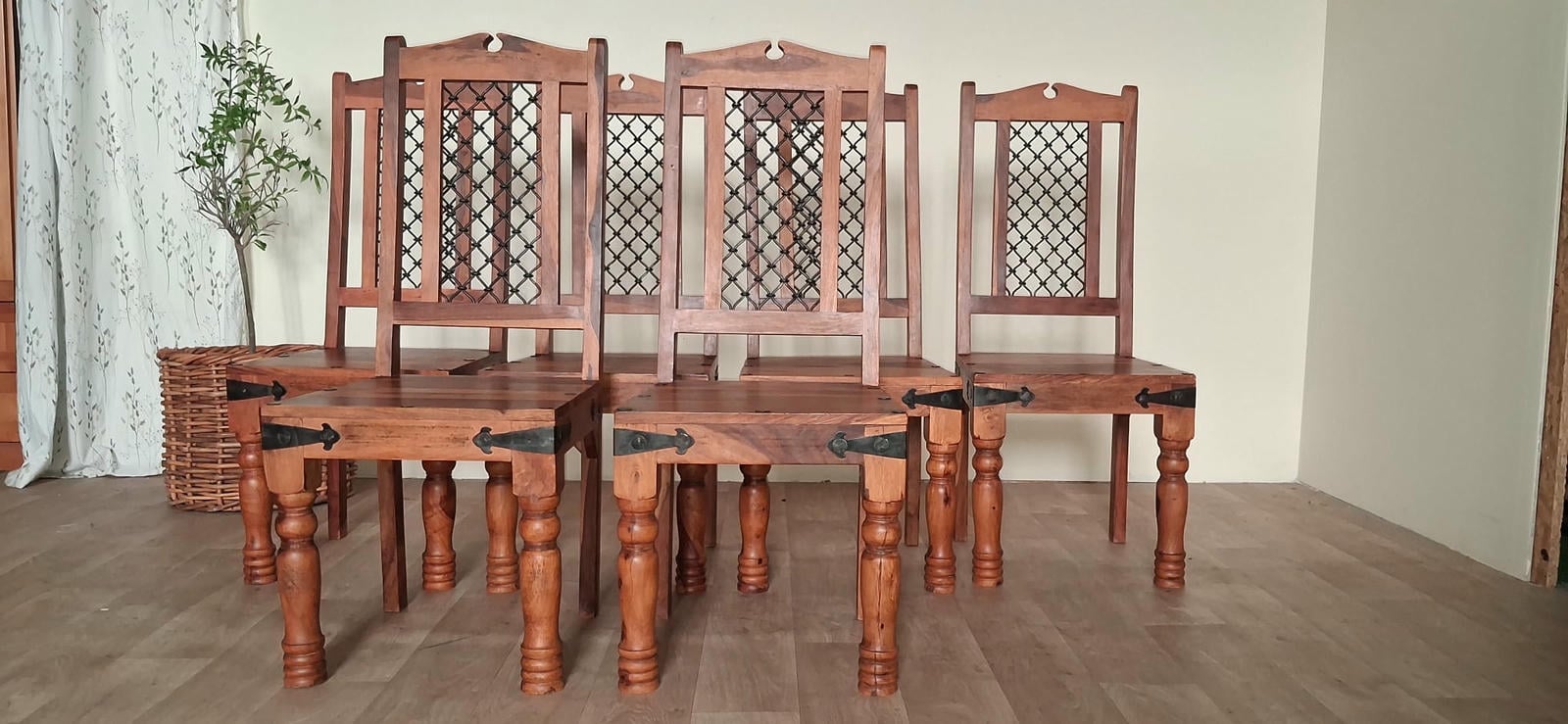Ten wyjątkowy zestaw kolonialny – stół i 6 krzeseł z metaloplastyką – to połączenie solidnego rzemiosła, naturalnego drewna i artystycznych detali. Wykonany z litego drewna, zachwyca swoją trwałością, masywnością oraz ciepłym, naturalnym odcieniem, który nadaje wnętrzu przytulności i elegancji.